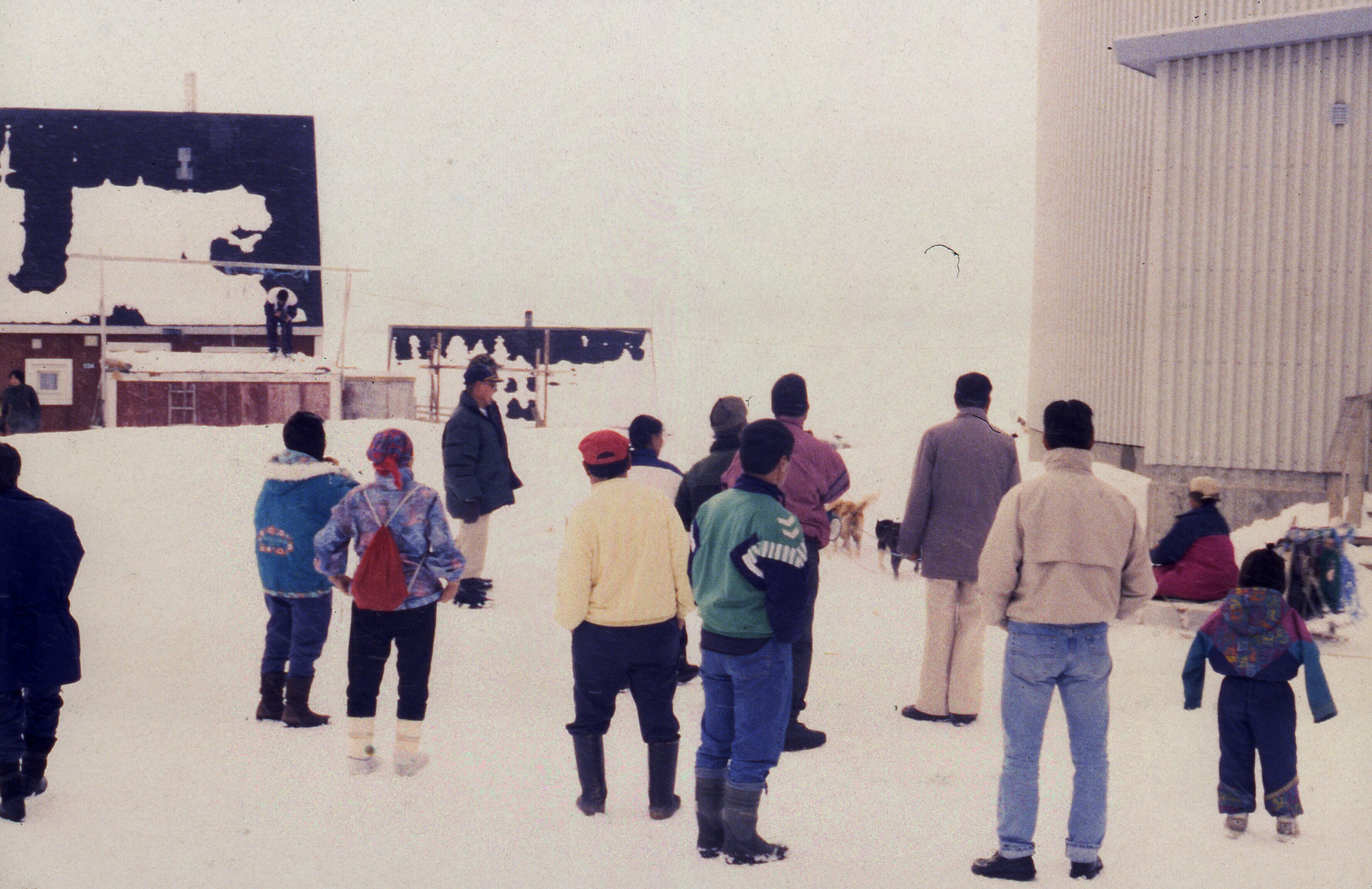 Mensen in Tiniteqilaaq wachten na de kerkdienst op h...