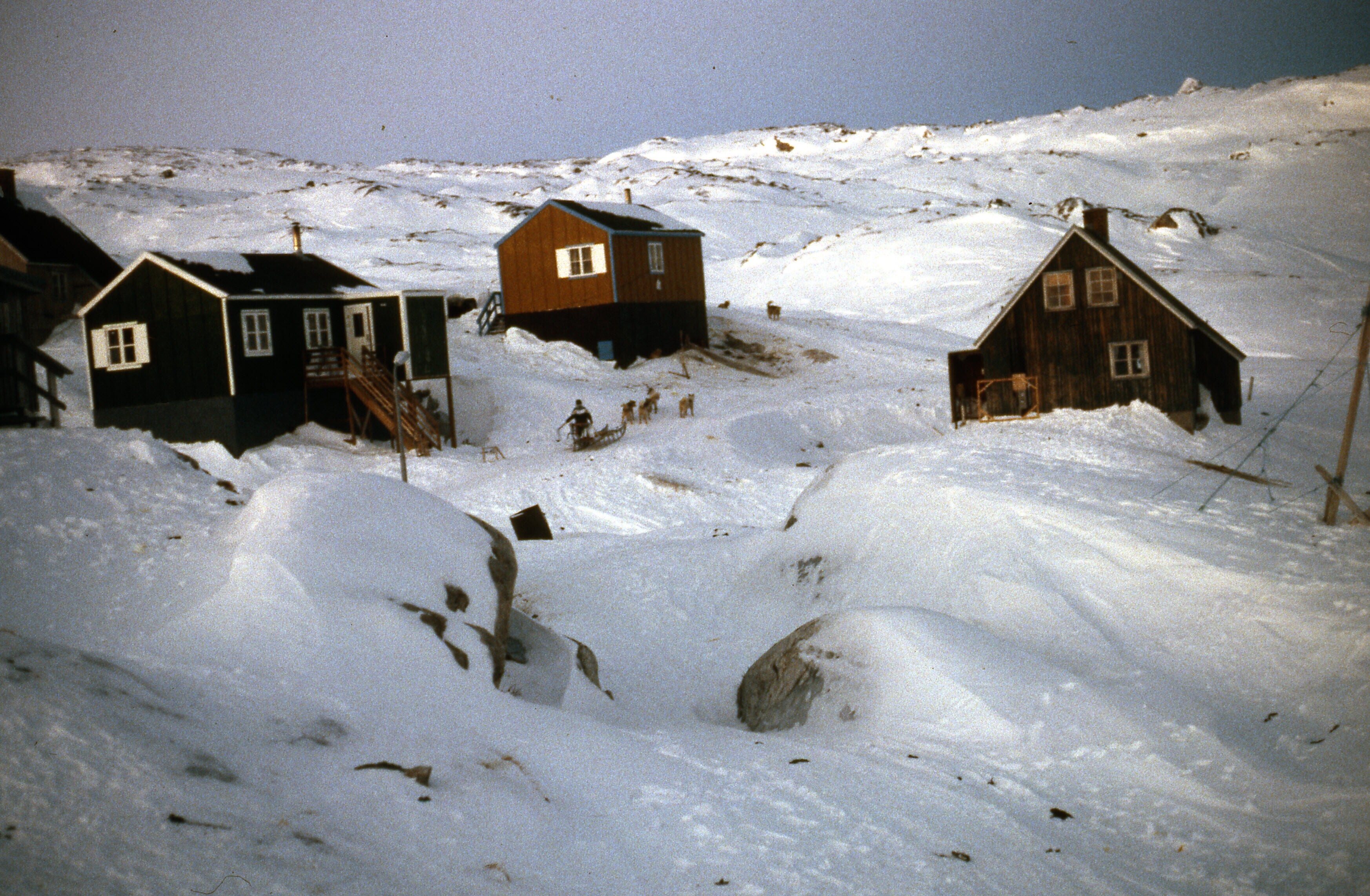 - Een hondenslee rijdt tussen de huizen van Tiniteqi...