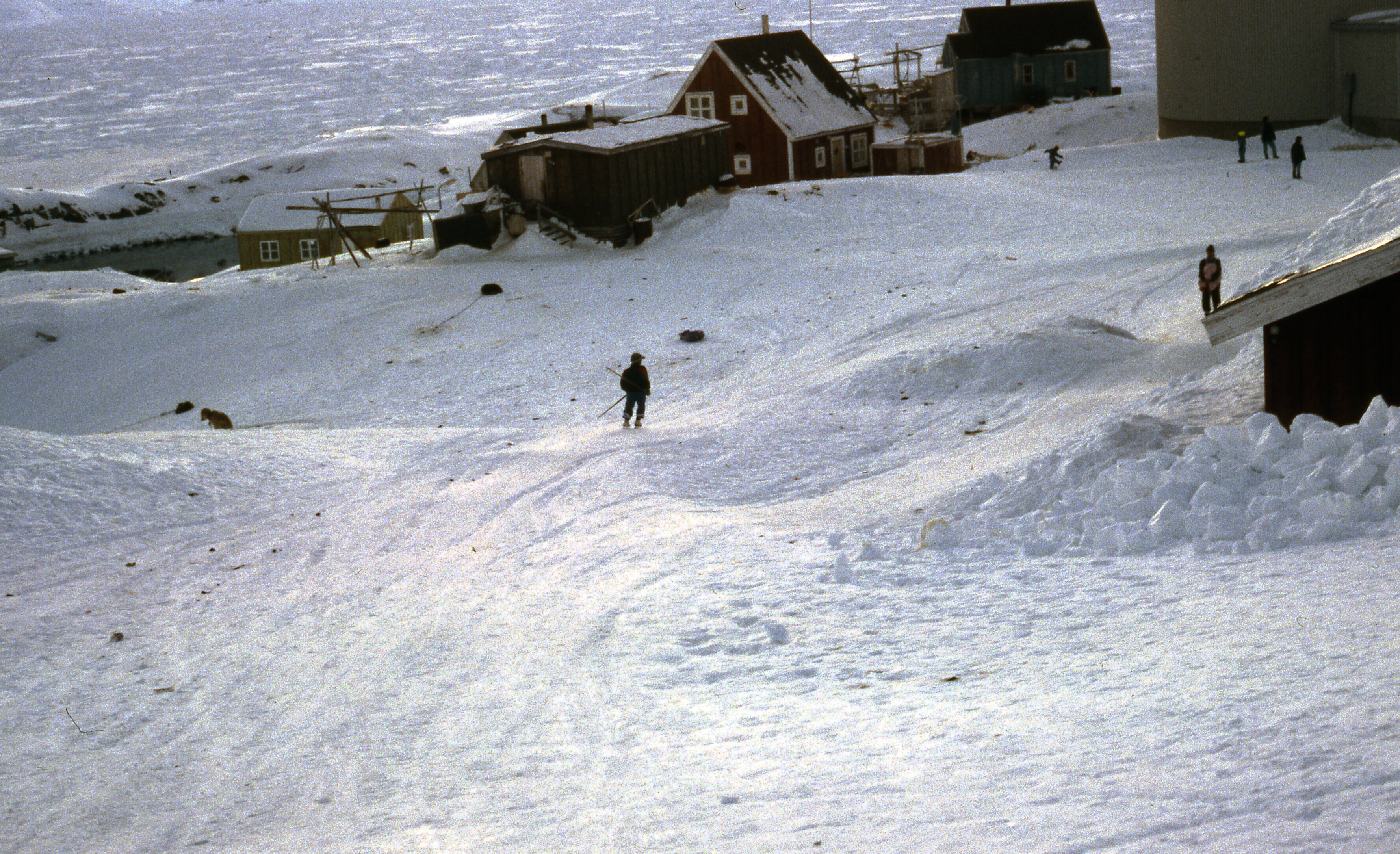 Huizen van Tniteqilaaq in de sneeuw, overdag, maart .