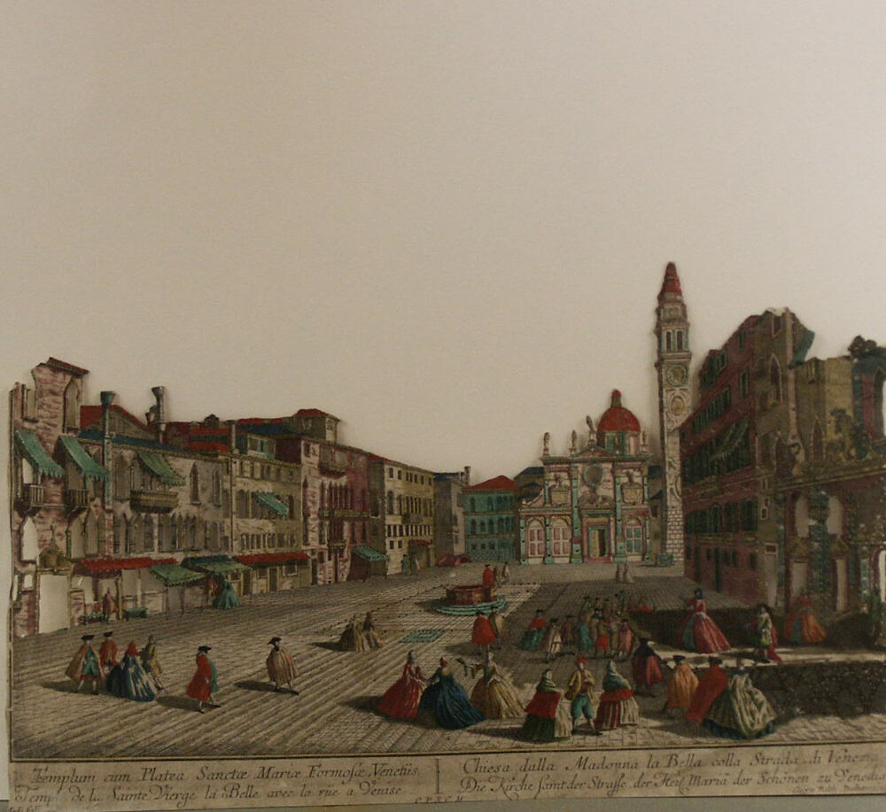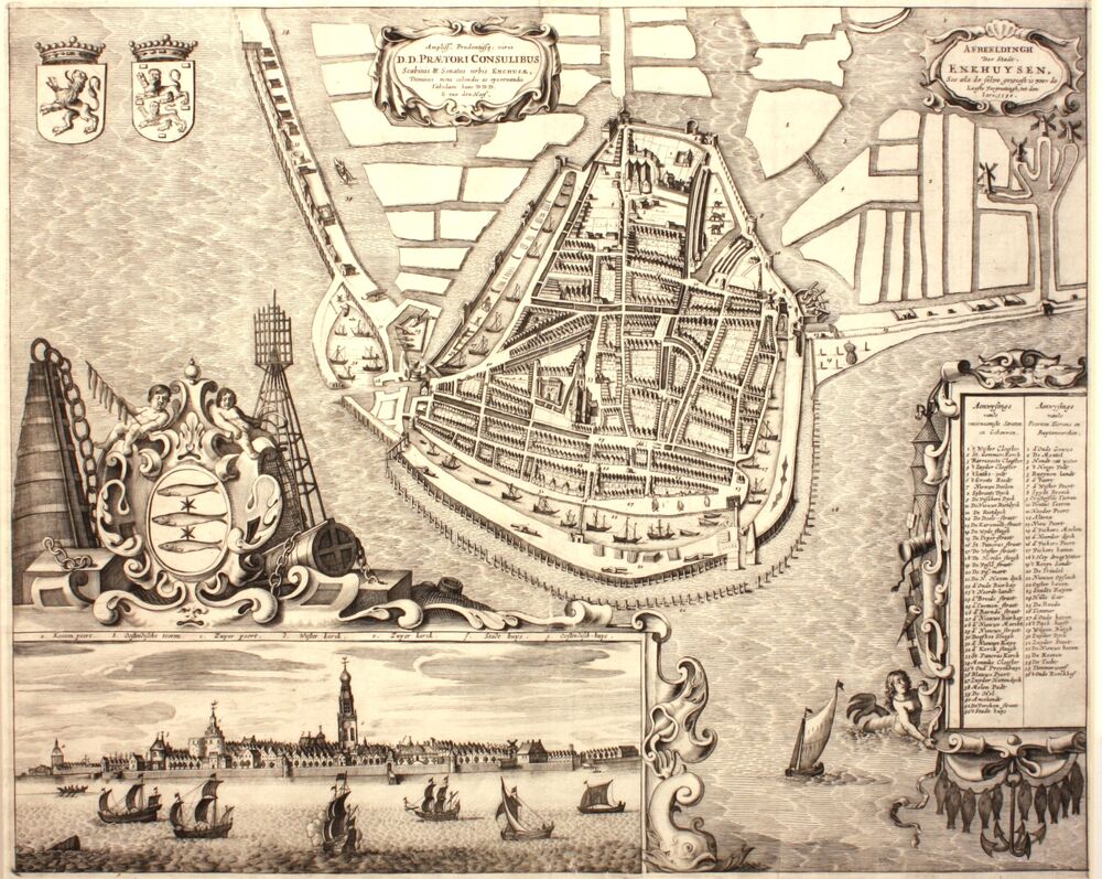 Gezicht in een stad met ruïnes en huizen. Kopergravu...