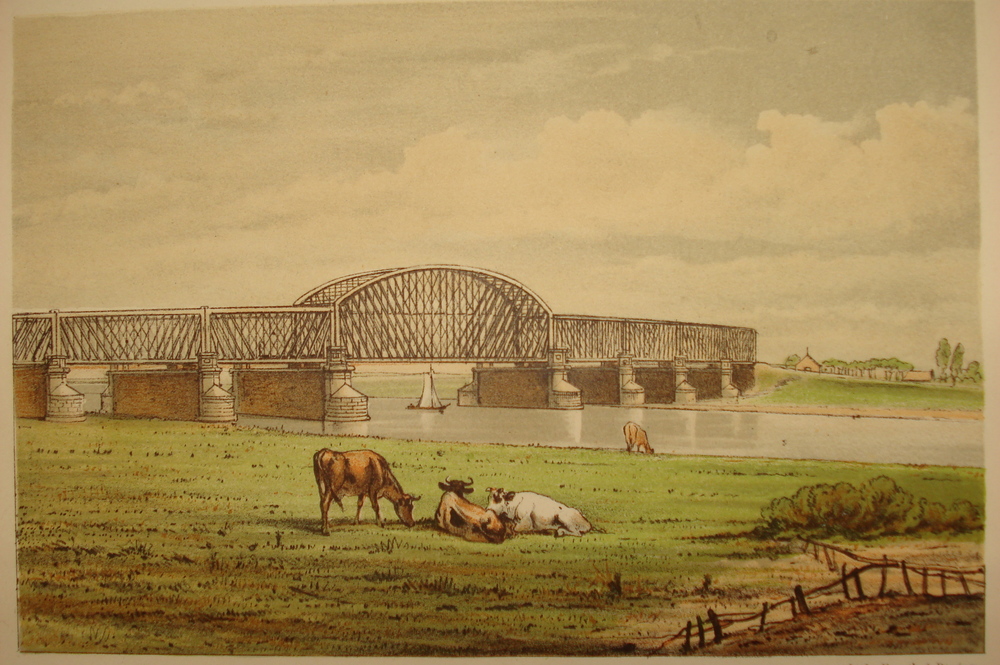 spoorbrug over de Maas bij Hedel. Litho in kleur van...