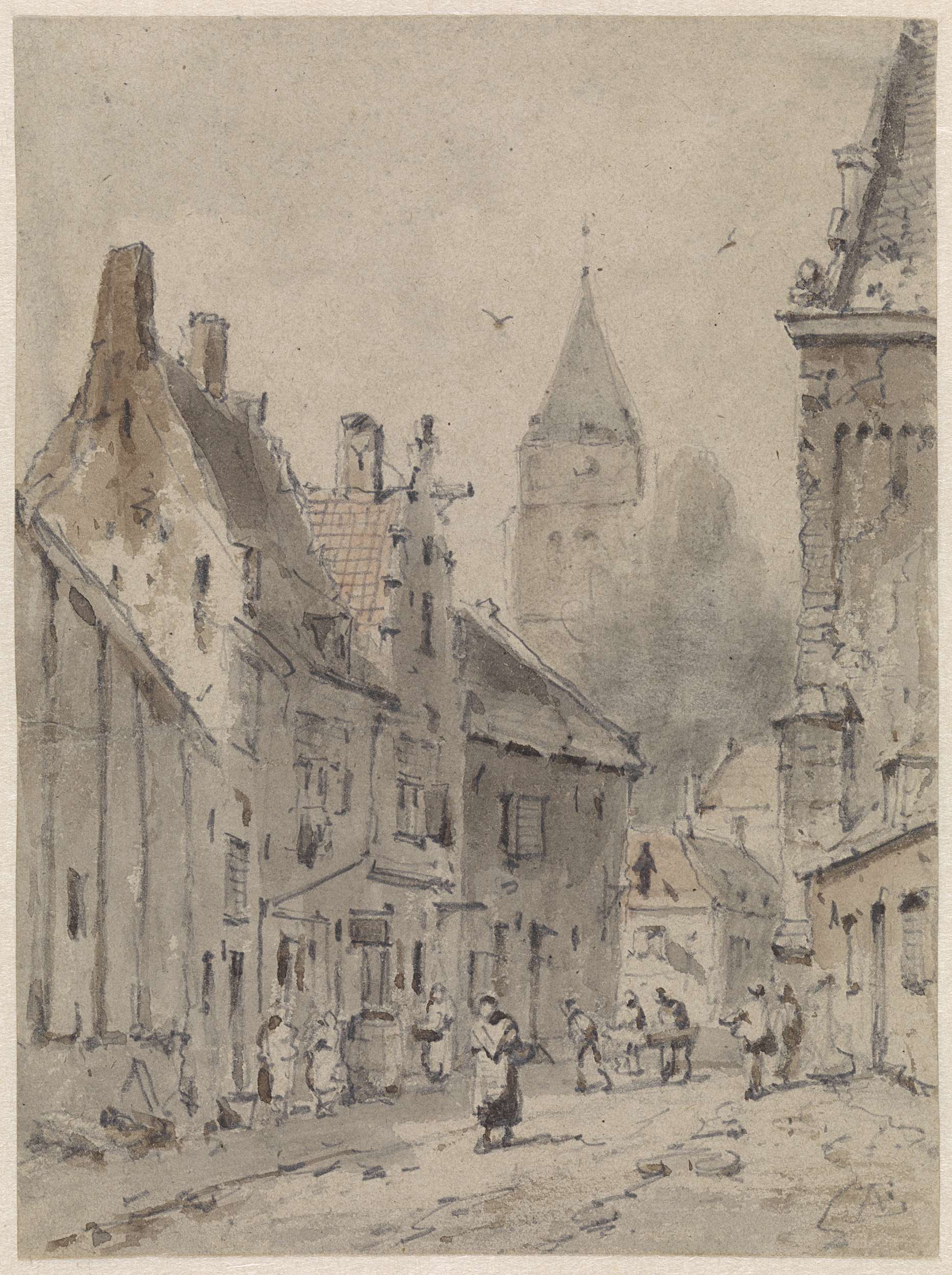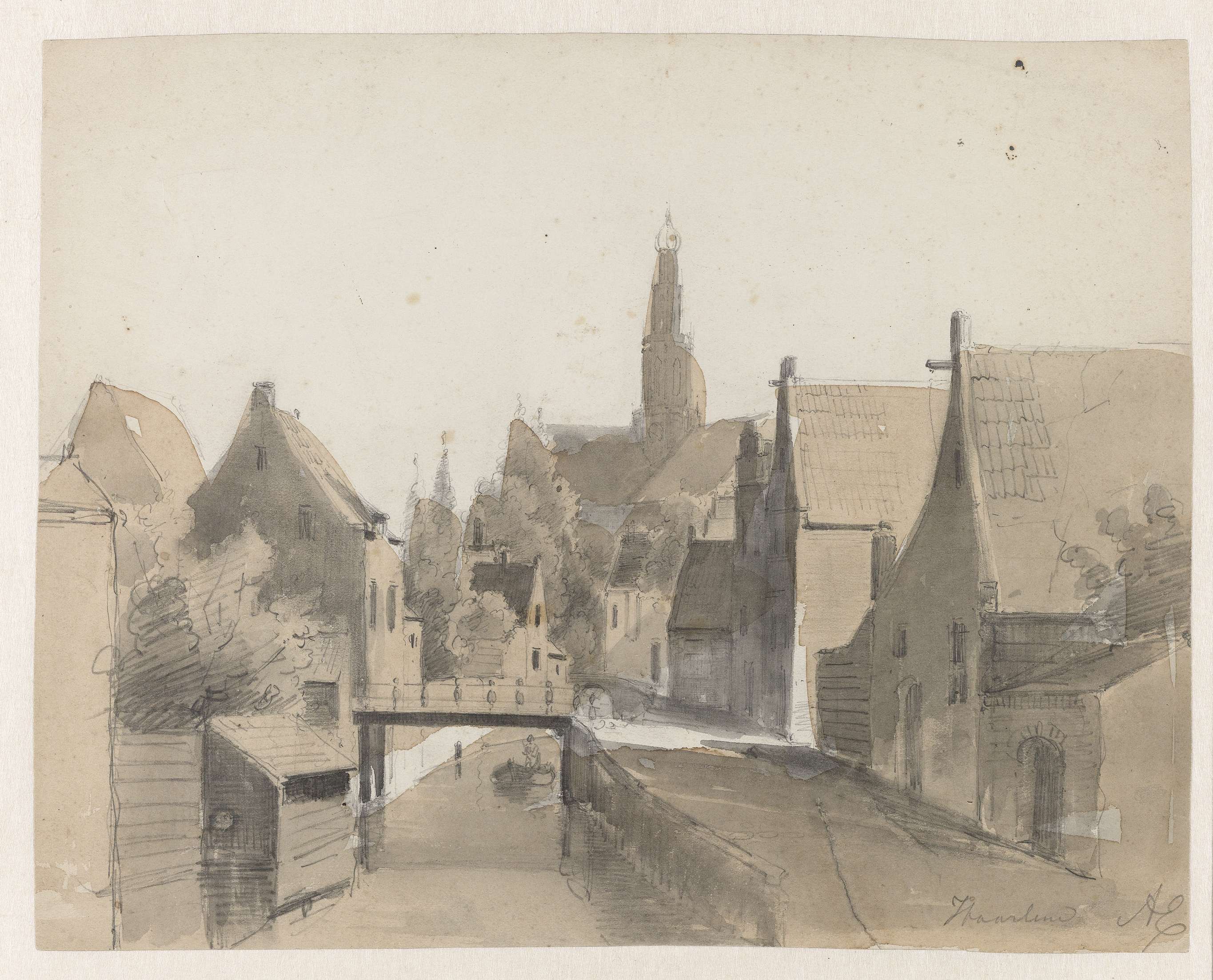 Gezicht op een grachtje in Haarlem, op de achtergron...