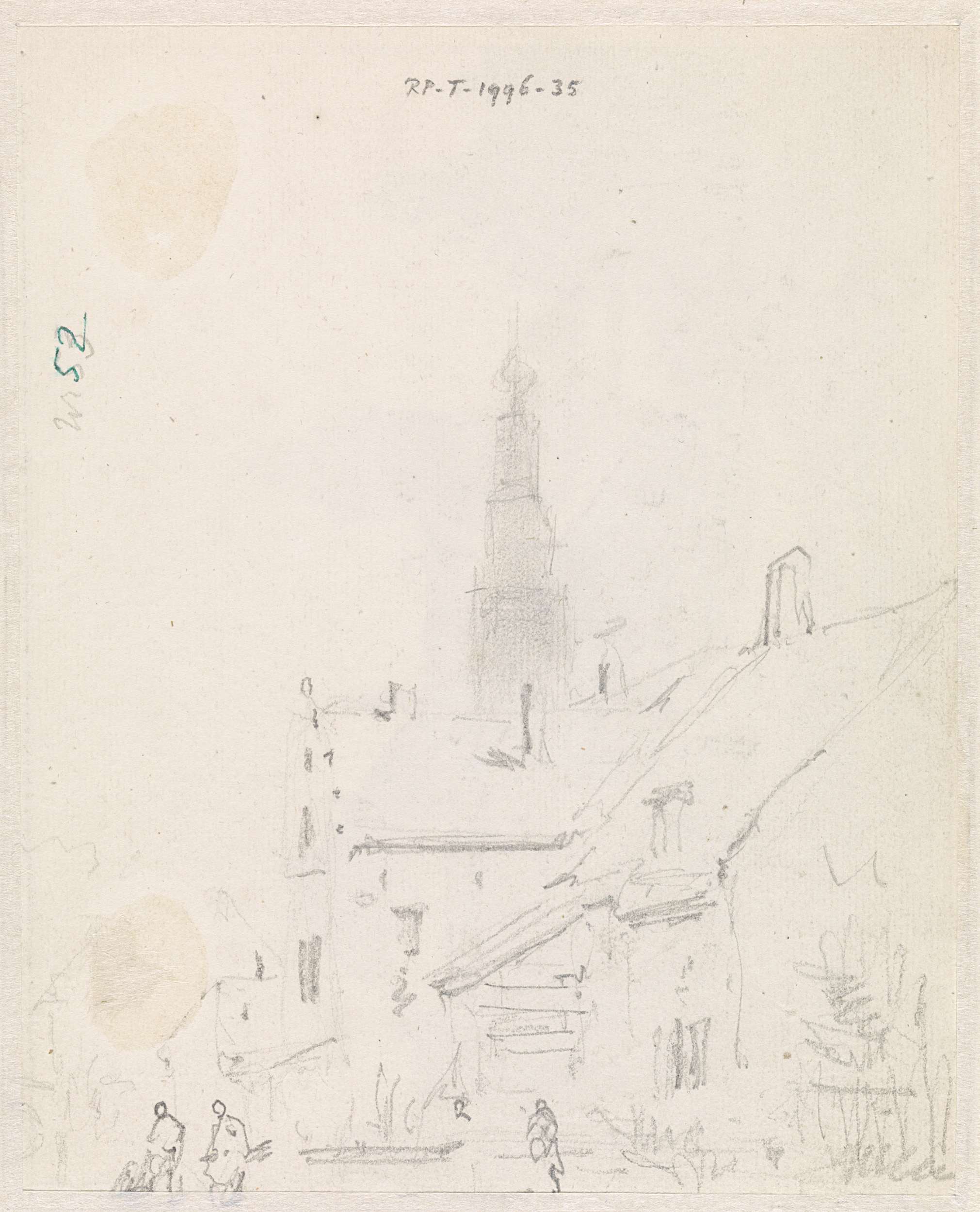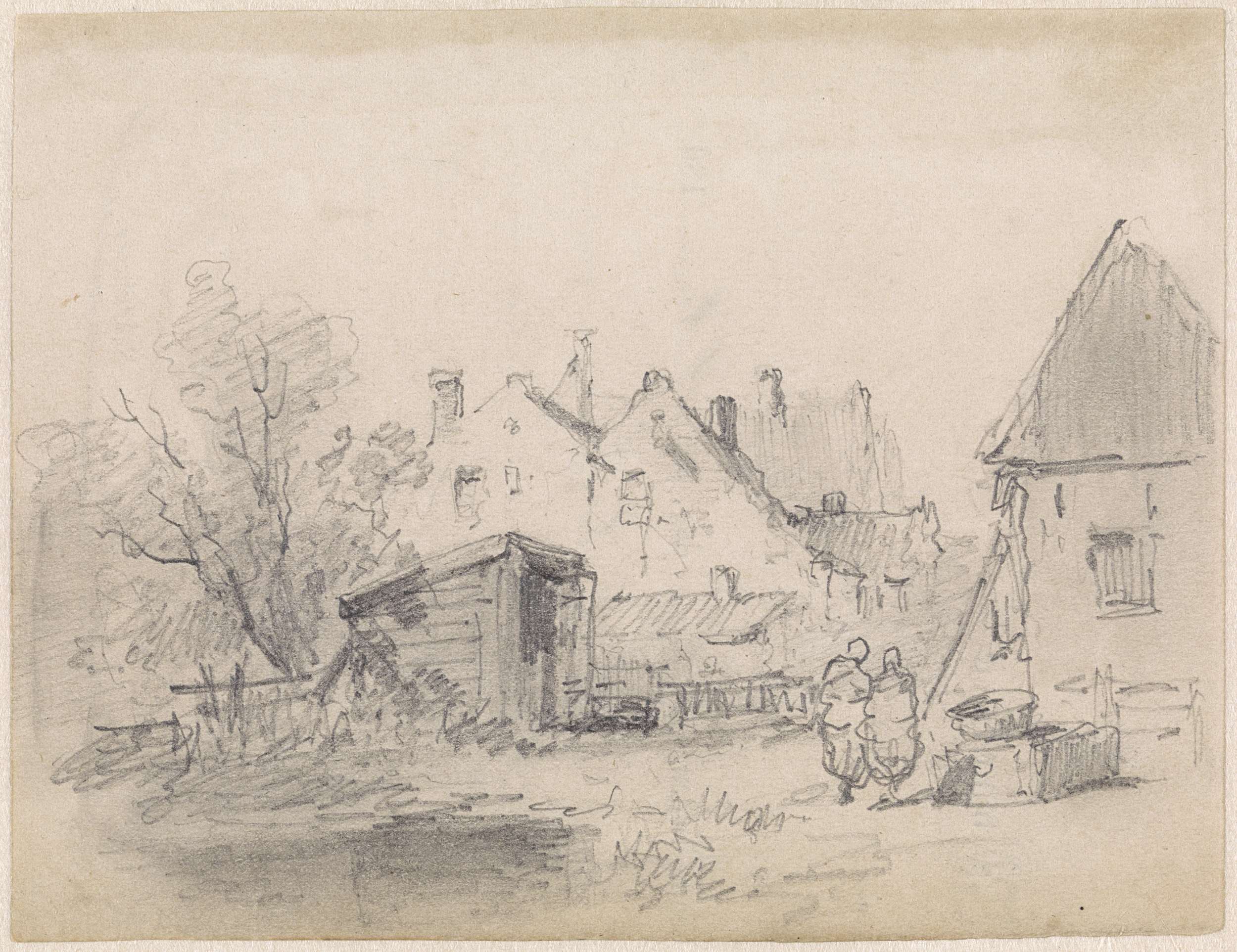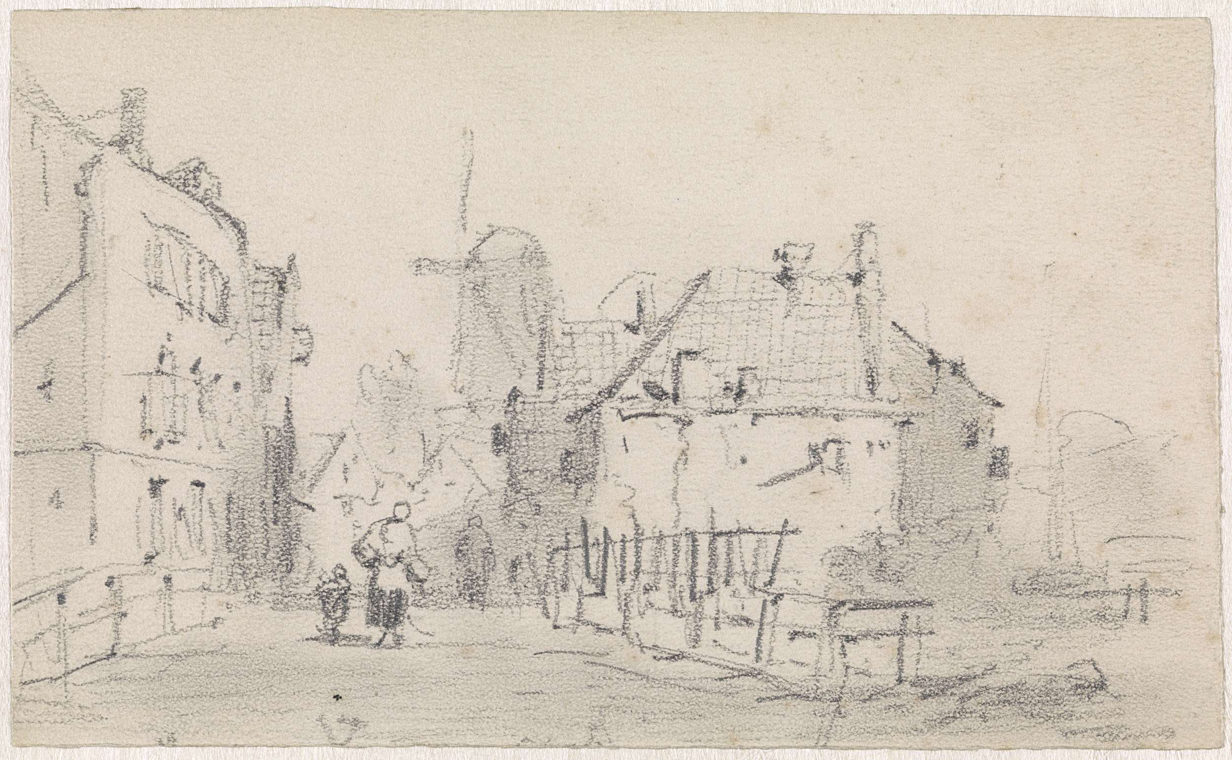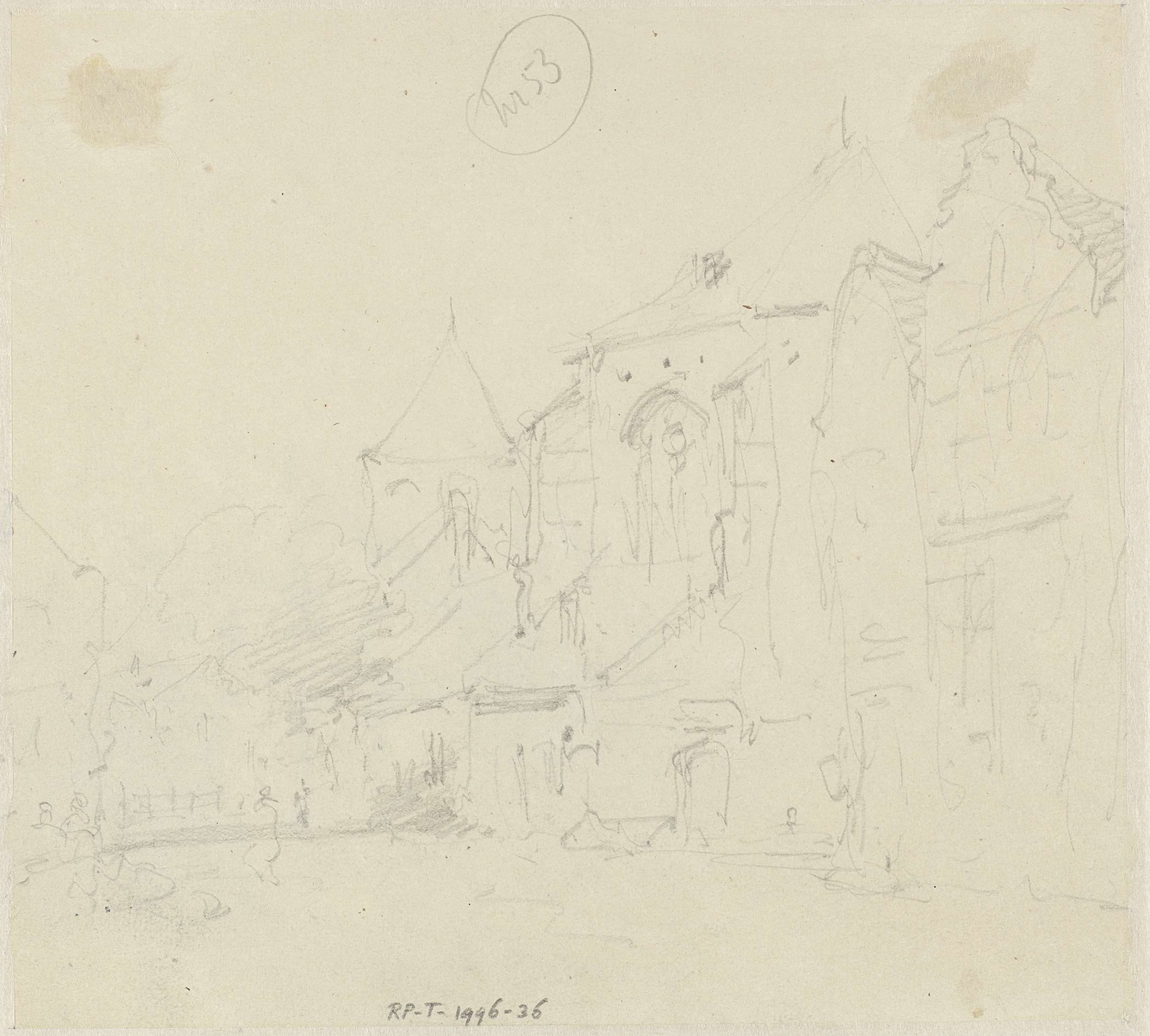 Gezicht op huizen aan de rand van Delft, rechts een ...