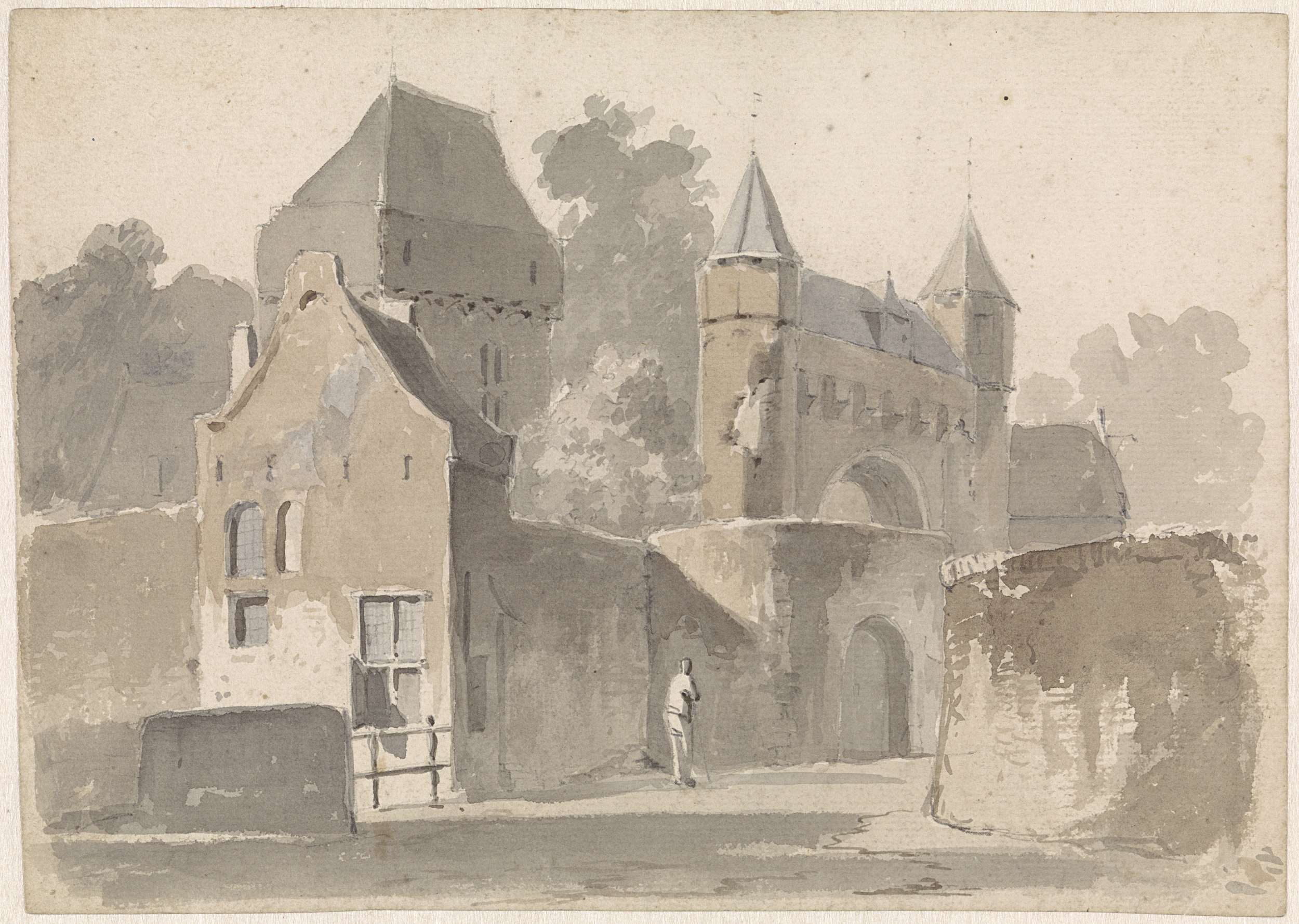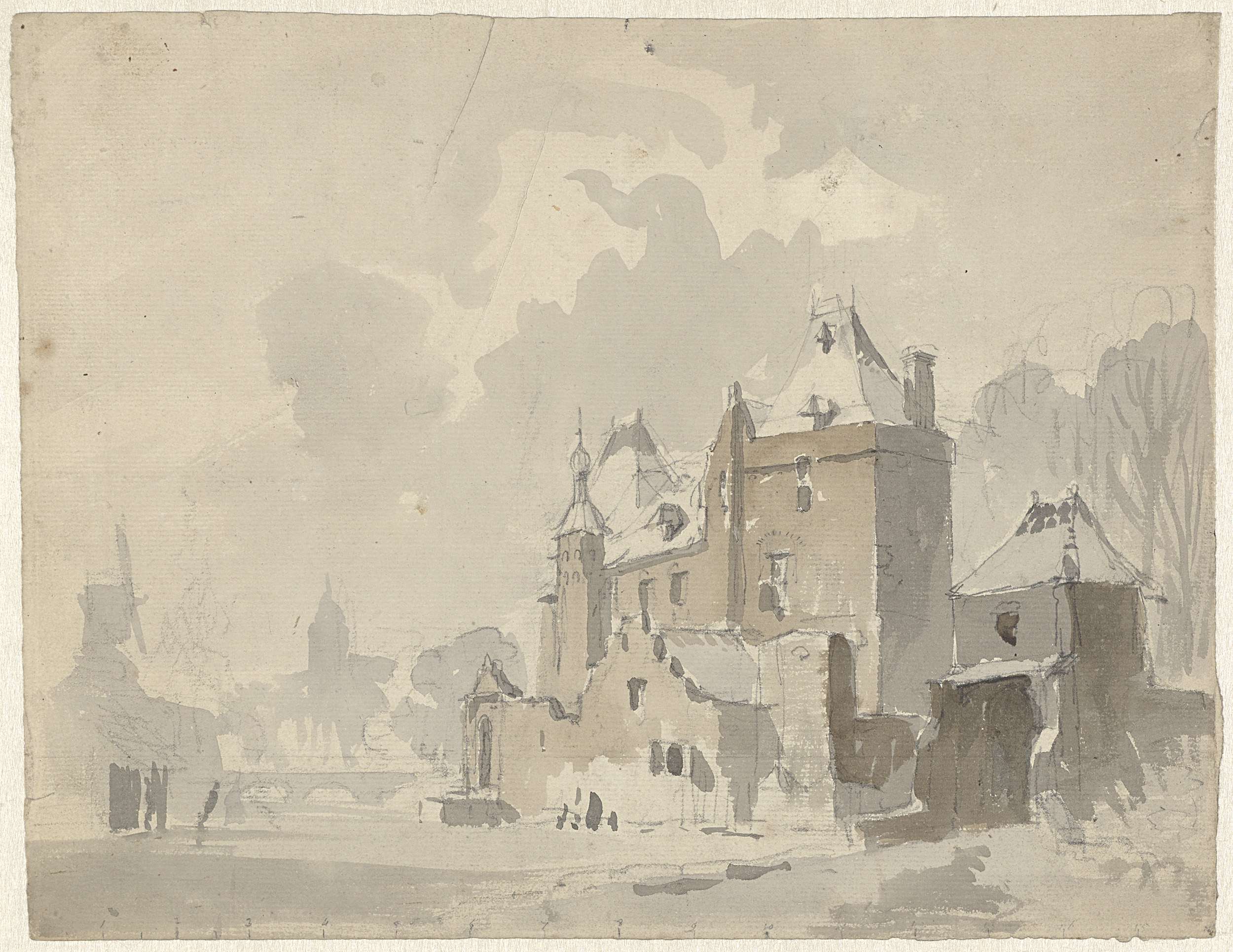 Gezicht op een gefantaseerd(?) kasteel nabij een stad
