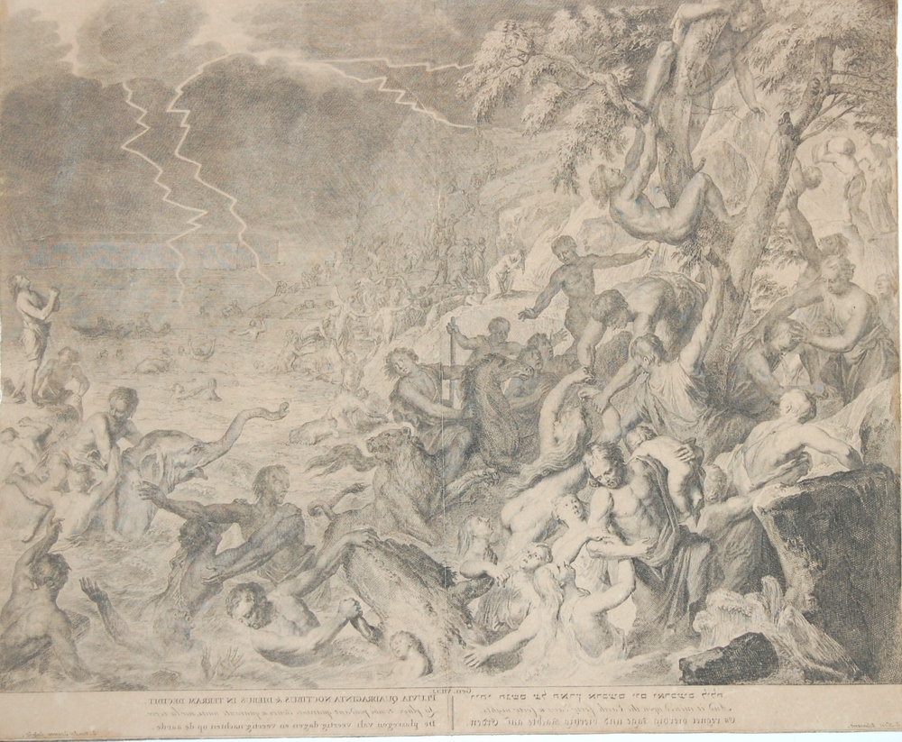 Zondvloed met verdrinkende mensen en dieren op papie...
