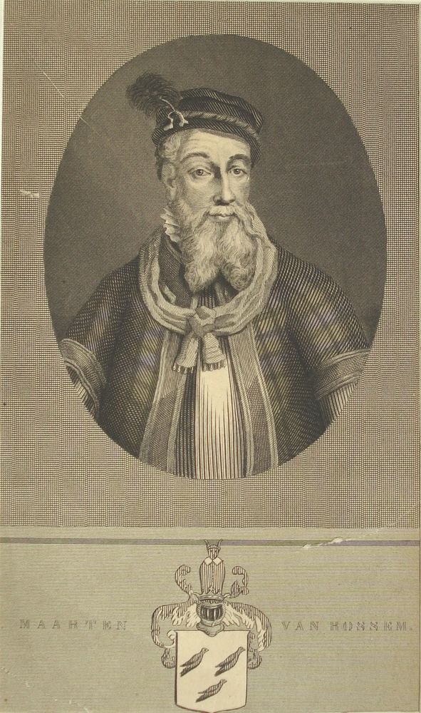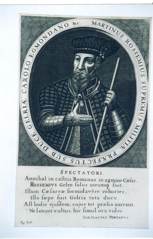 Portret van Maarten van Rossem met familiewapen