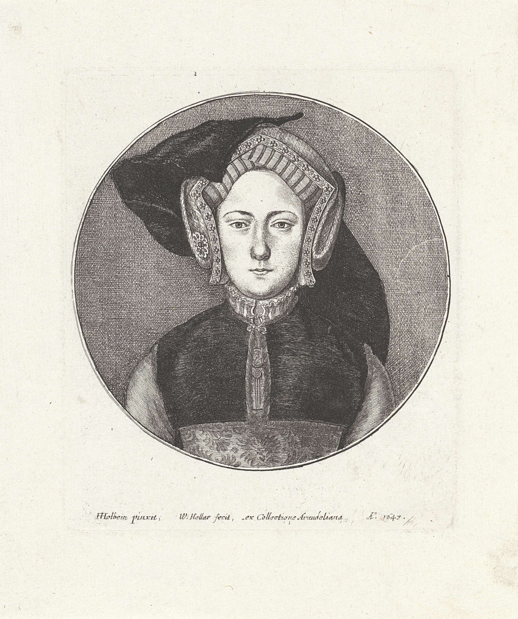 Portret van jonge vrouw met gepluimde bonnet
