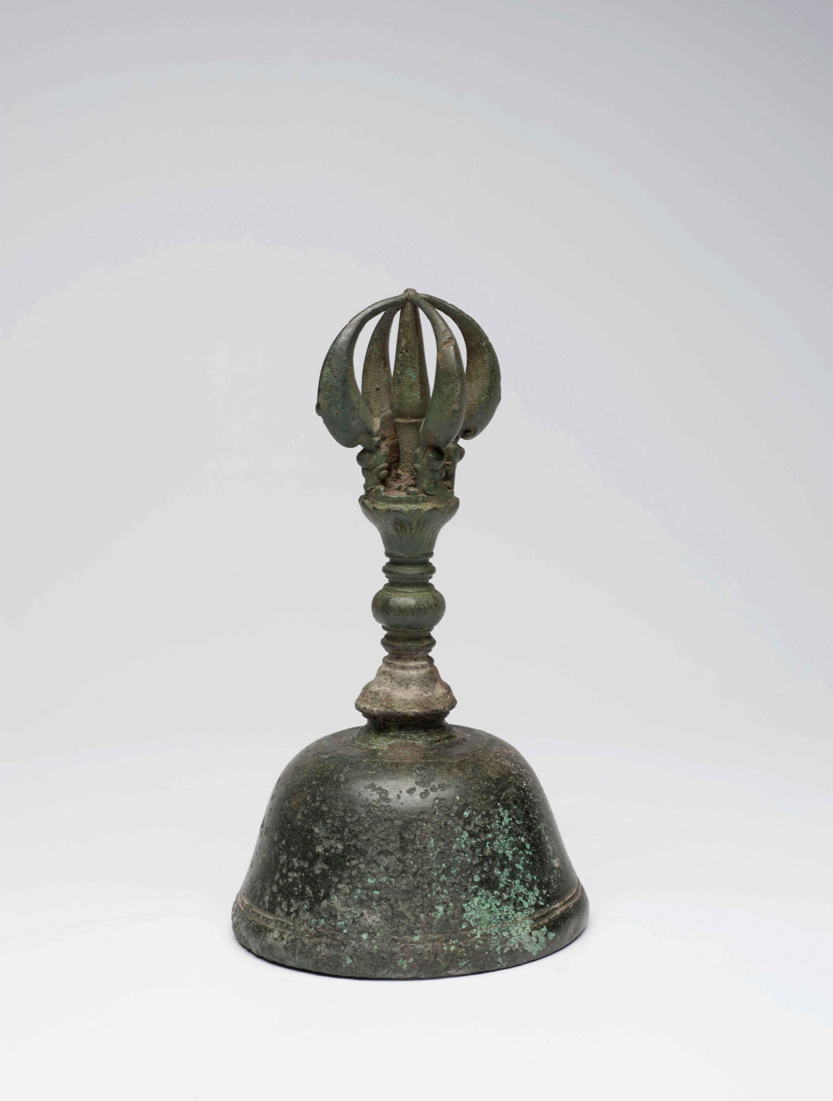 Indo-Javaanse bidschel met handvat en klepel brons