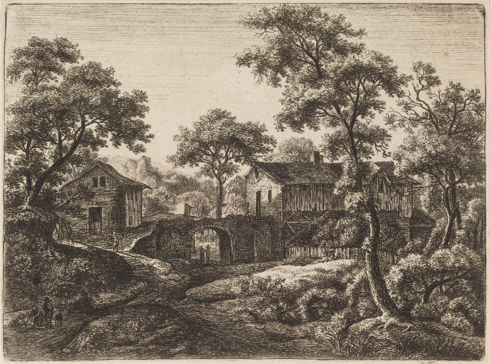 Kudde bij een stenen brug