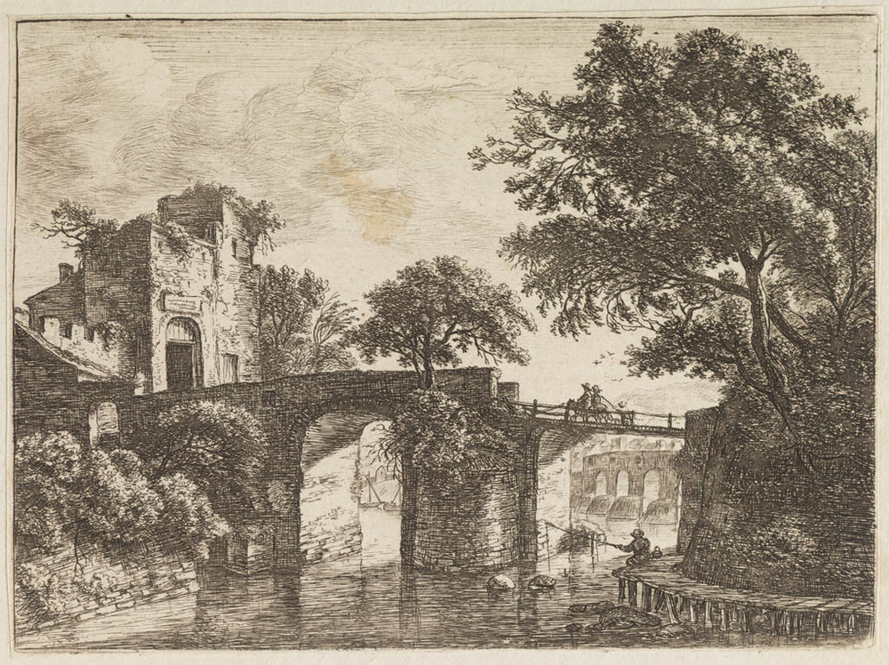 Vier mannen bij een stenen brug
