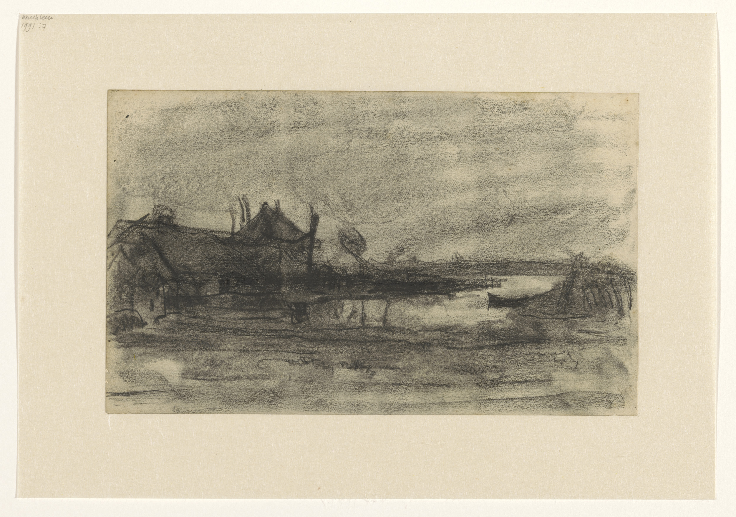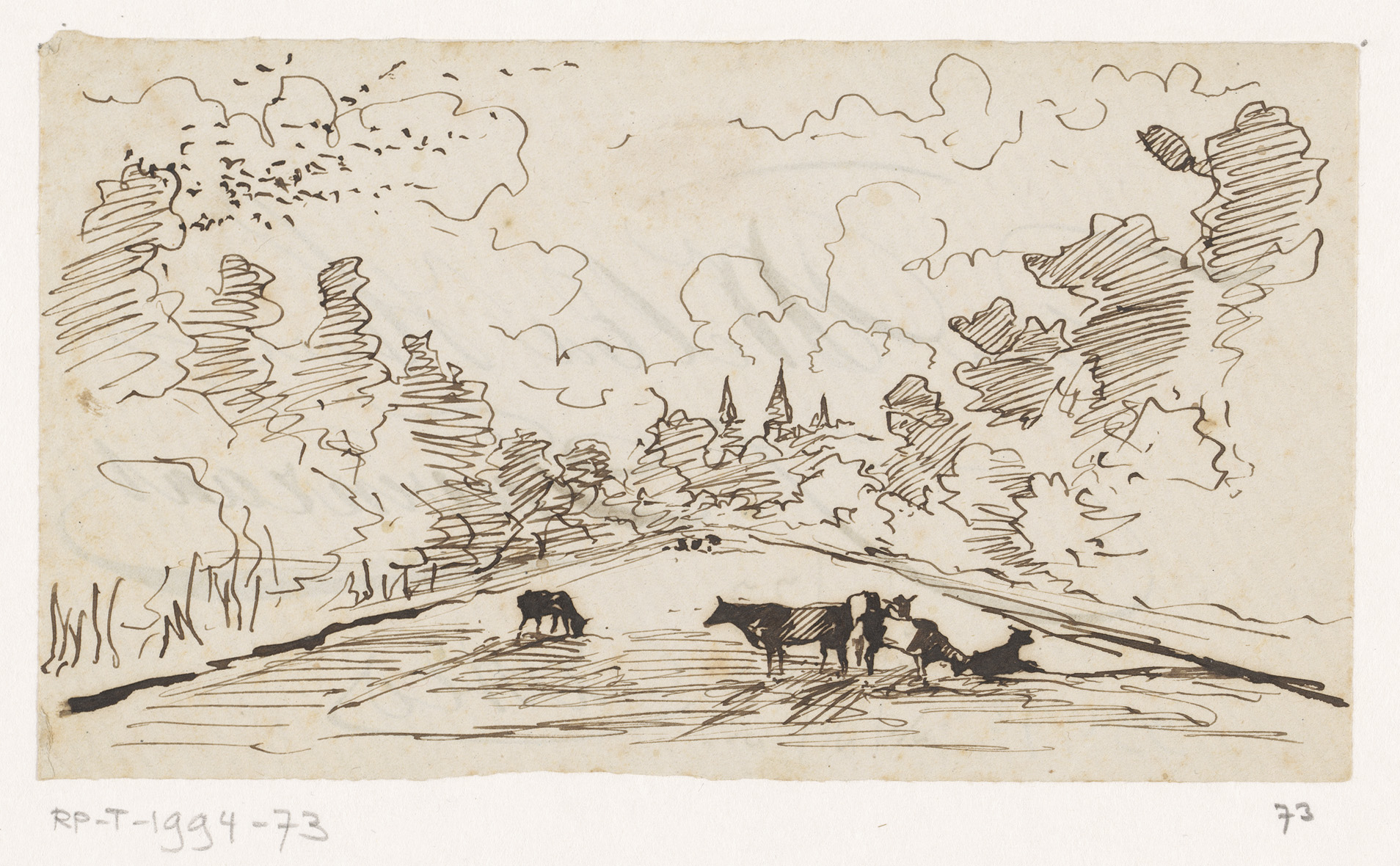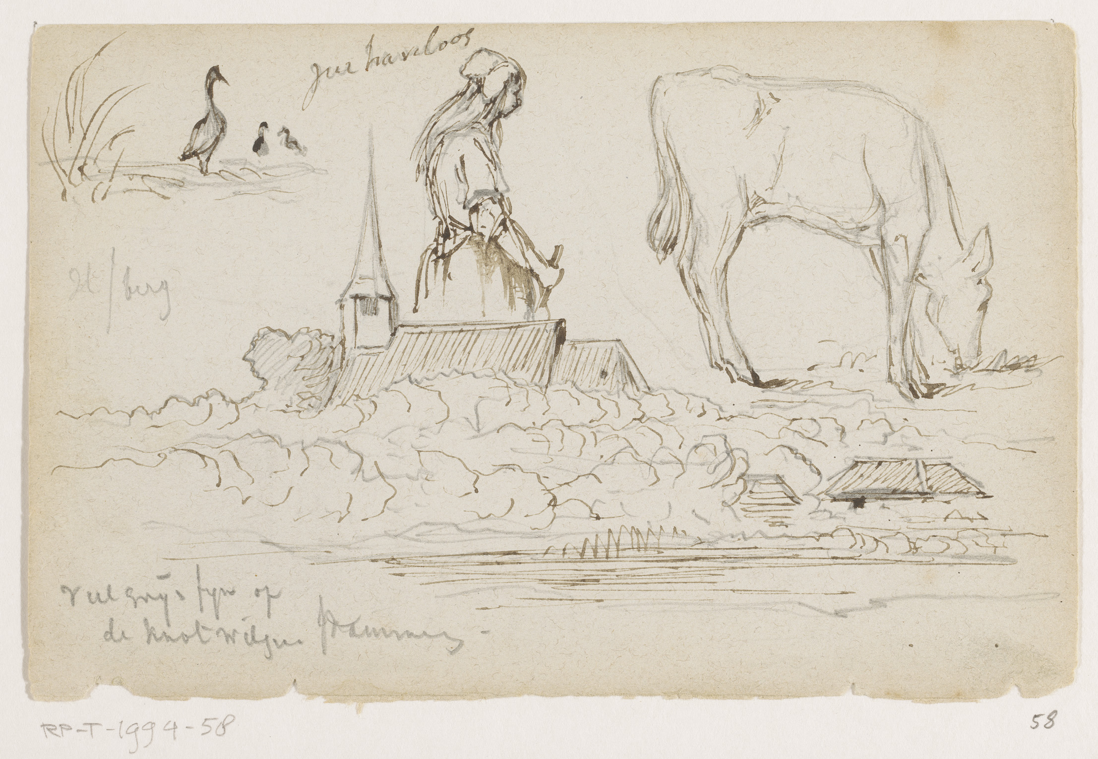 Kerkje tussen bomen, eenden, een kalf en een boerenmeid