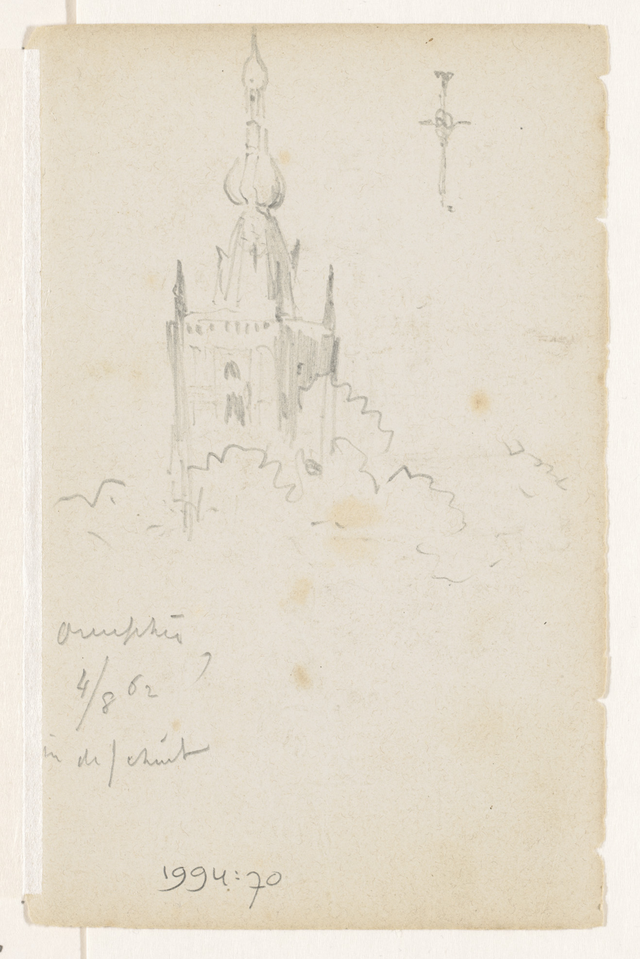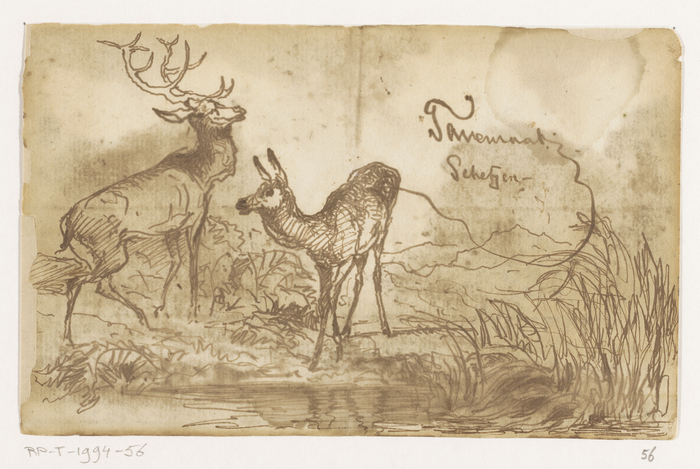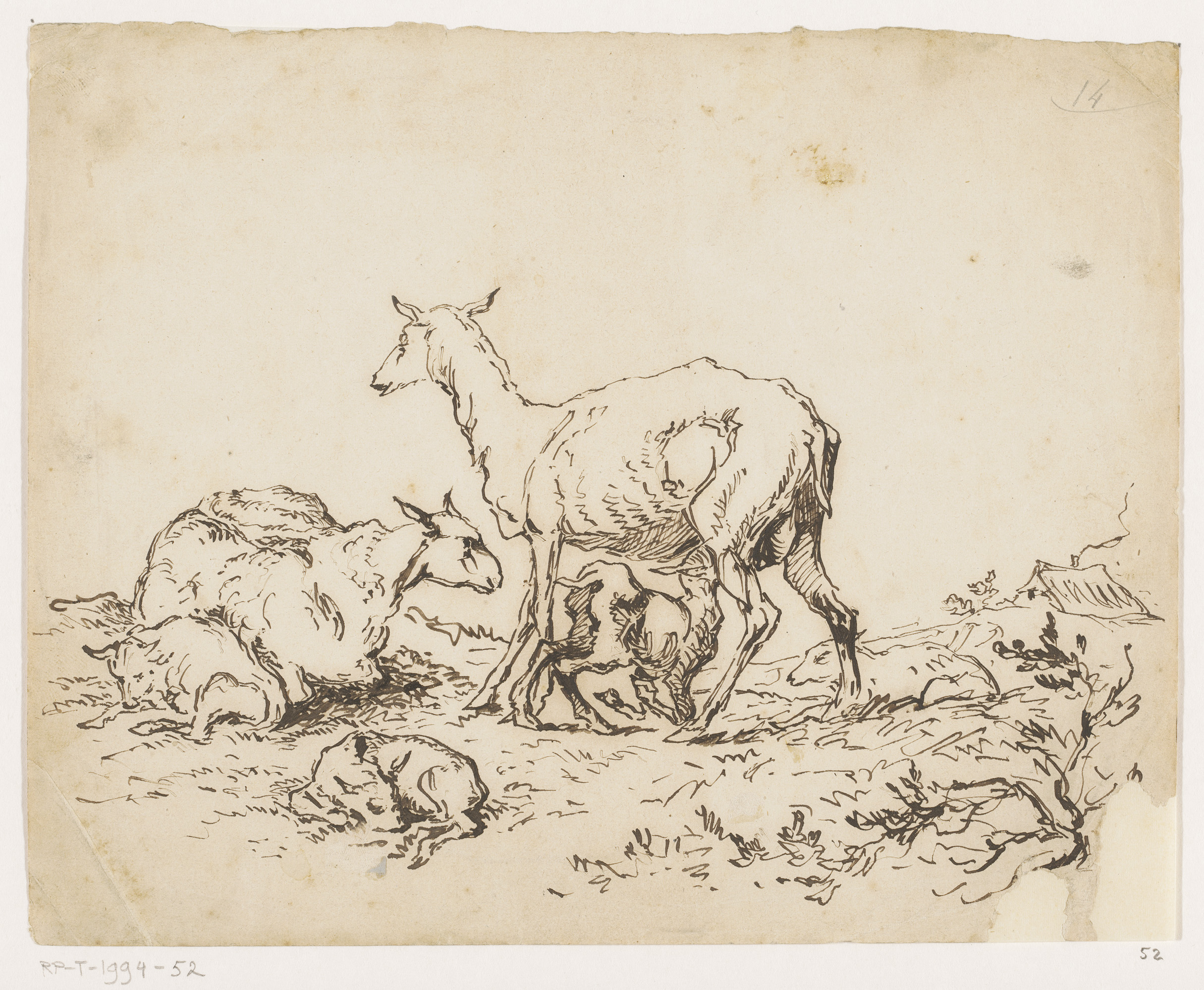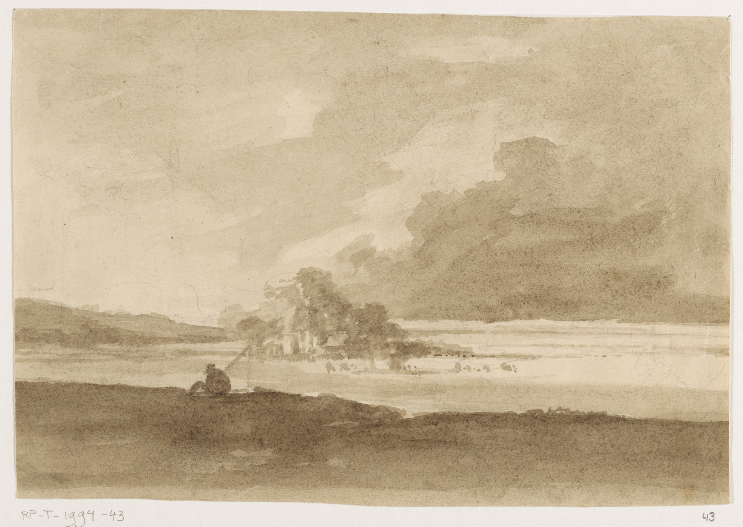 Kerkje tussen bomen, eenden, een kalf en een boerenmeid