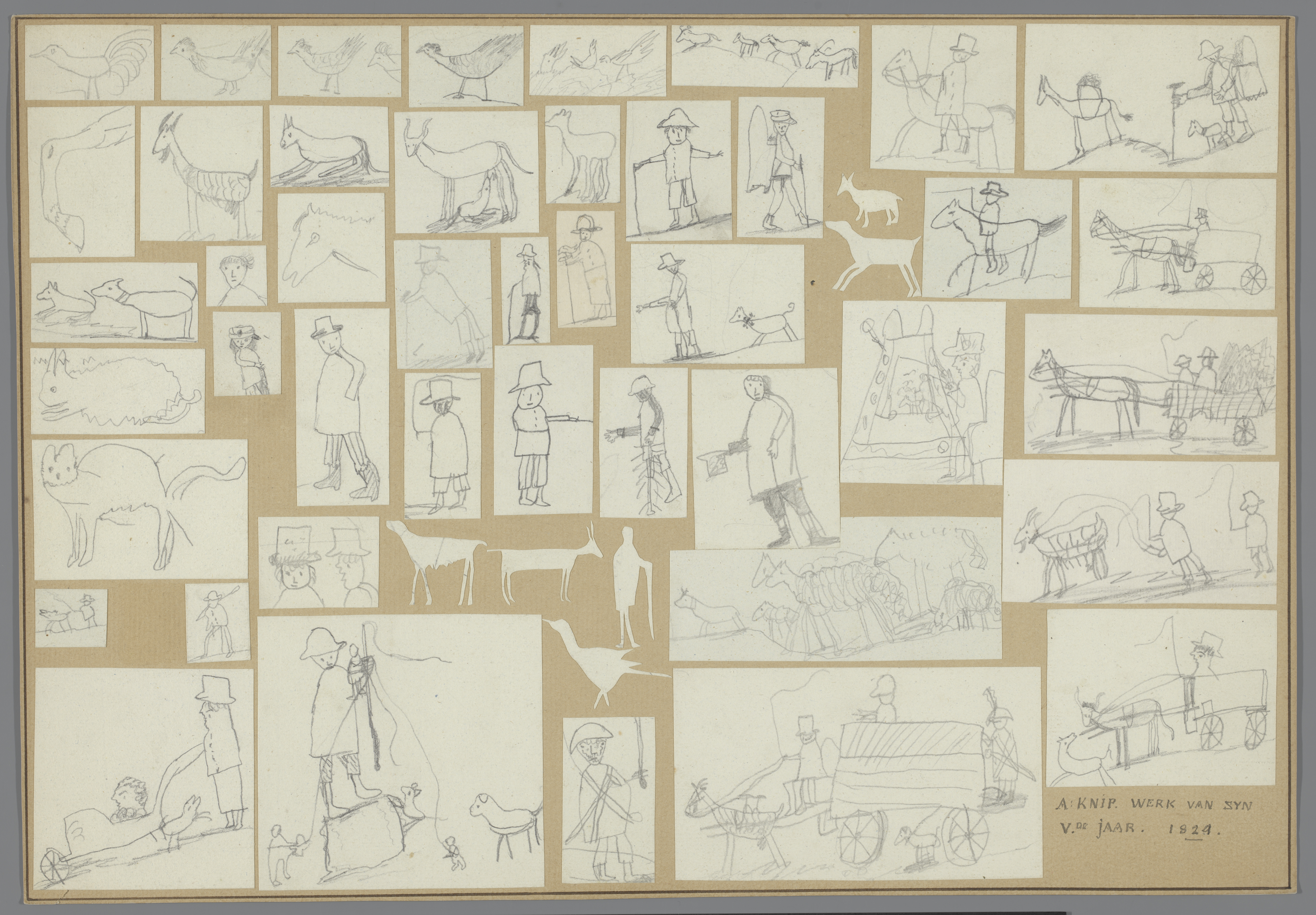 Karton waarop 43 kindertekeningen van dieren en mens...