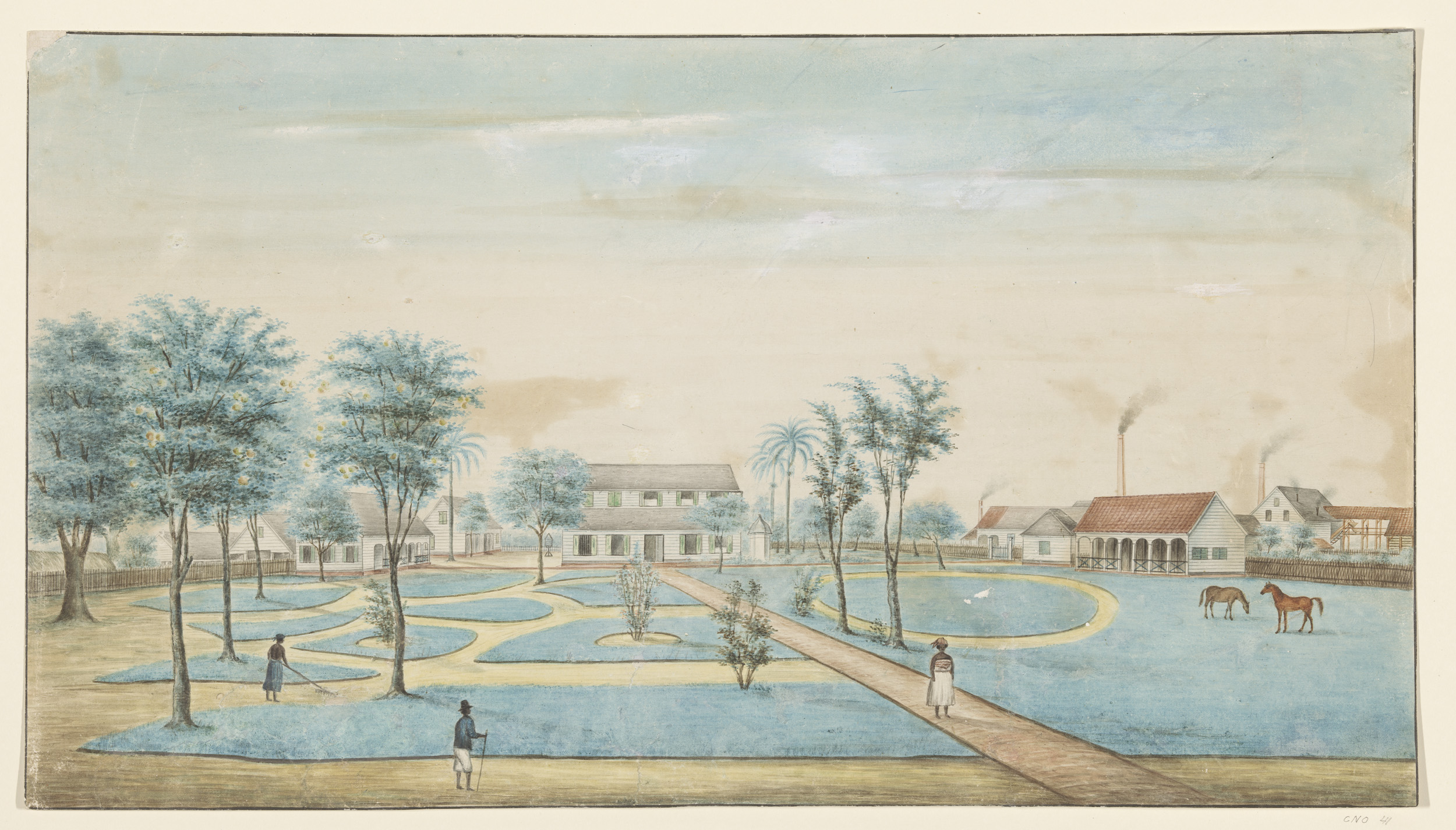 Gezicht op de suikerplantage Catharina Sophia vanaf ...