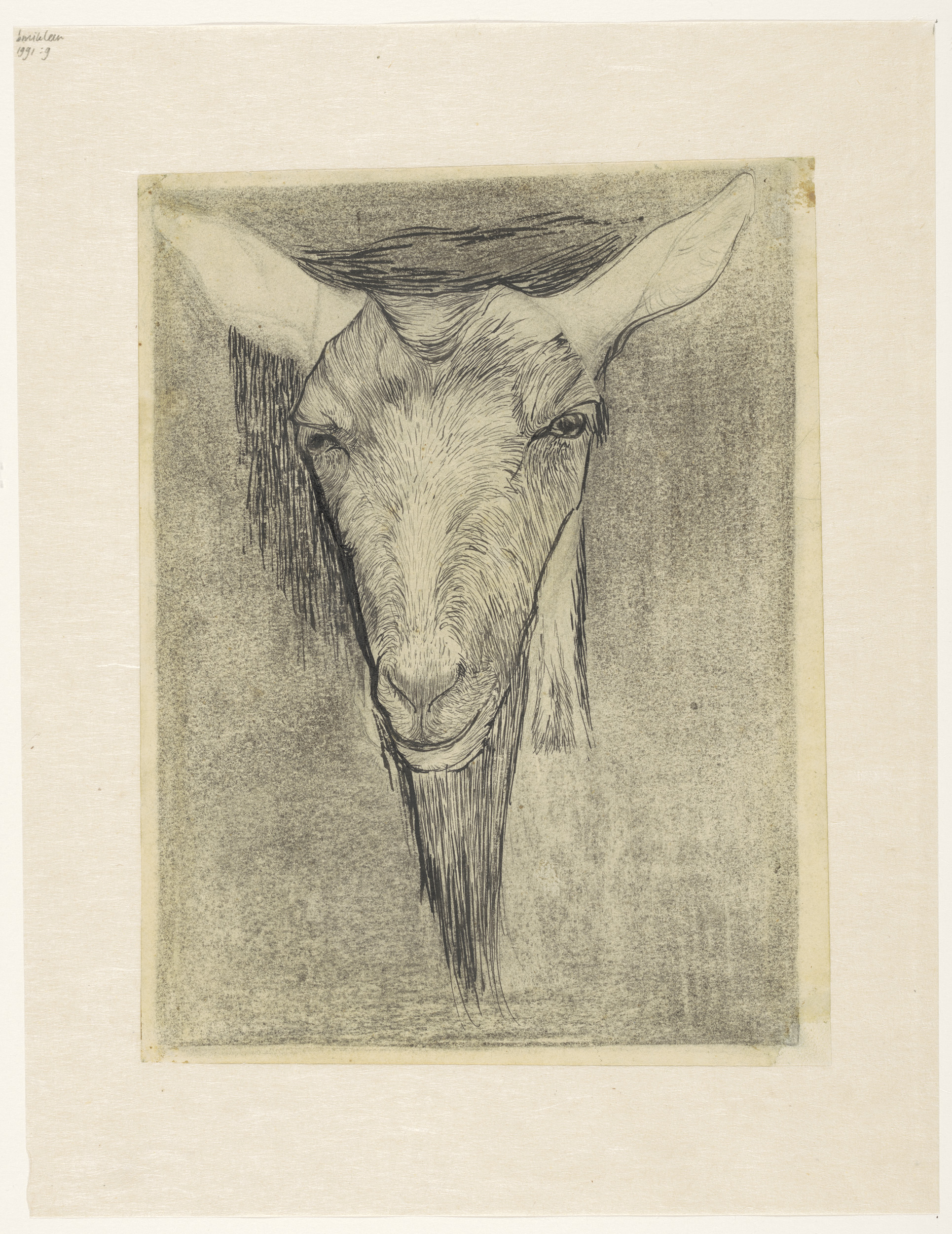 Karton waarop 6 kindertekeningen van dieren, een men...