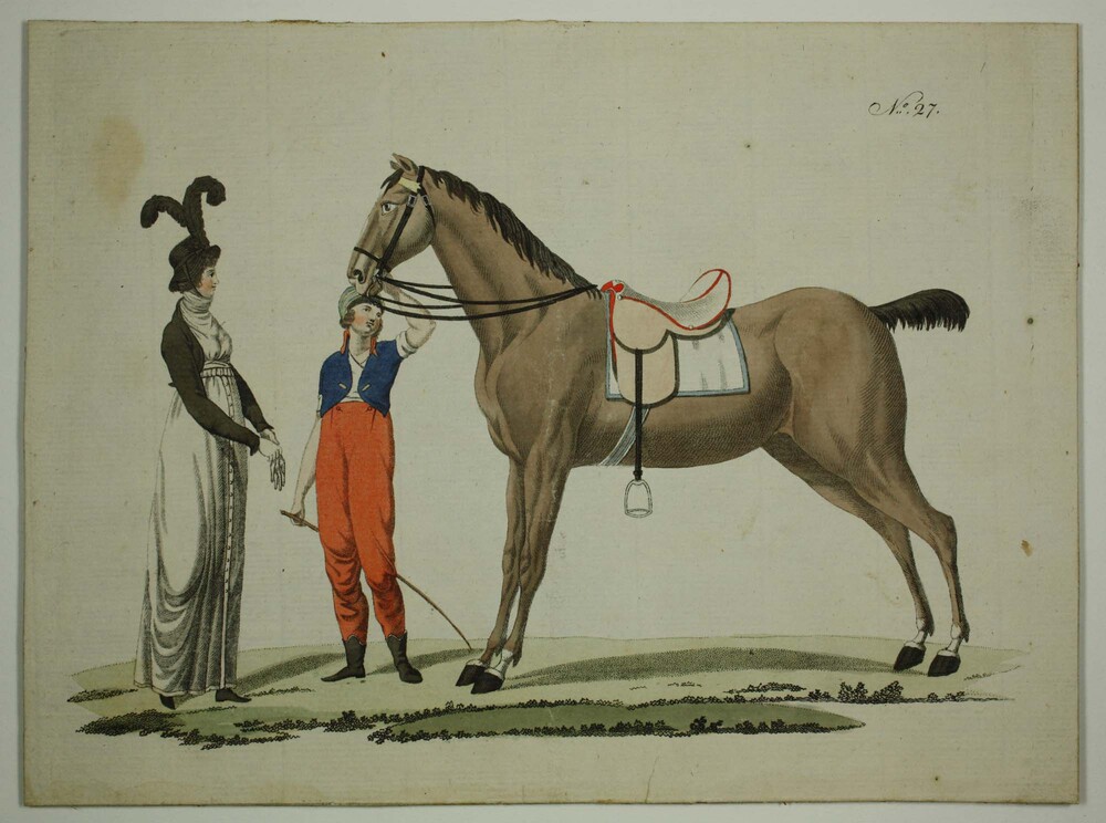 Dame in Empire Costuum naast een jockey met paard.