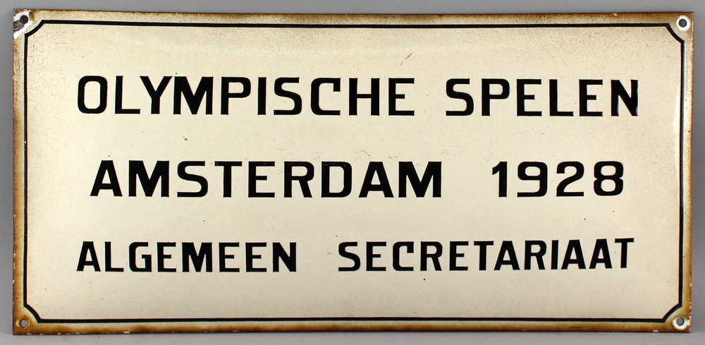 Emaille wit tekstbord “OLYMPISCHE SPELEN, AMSTERDAM ...