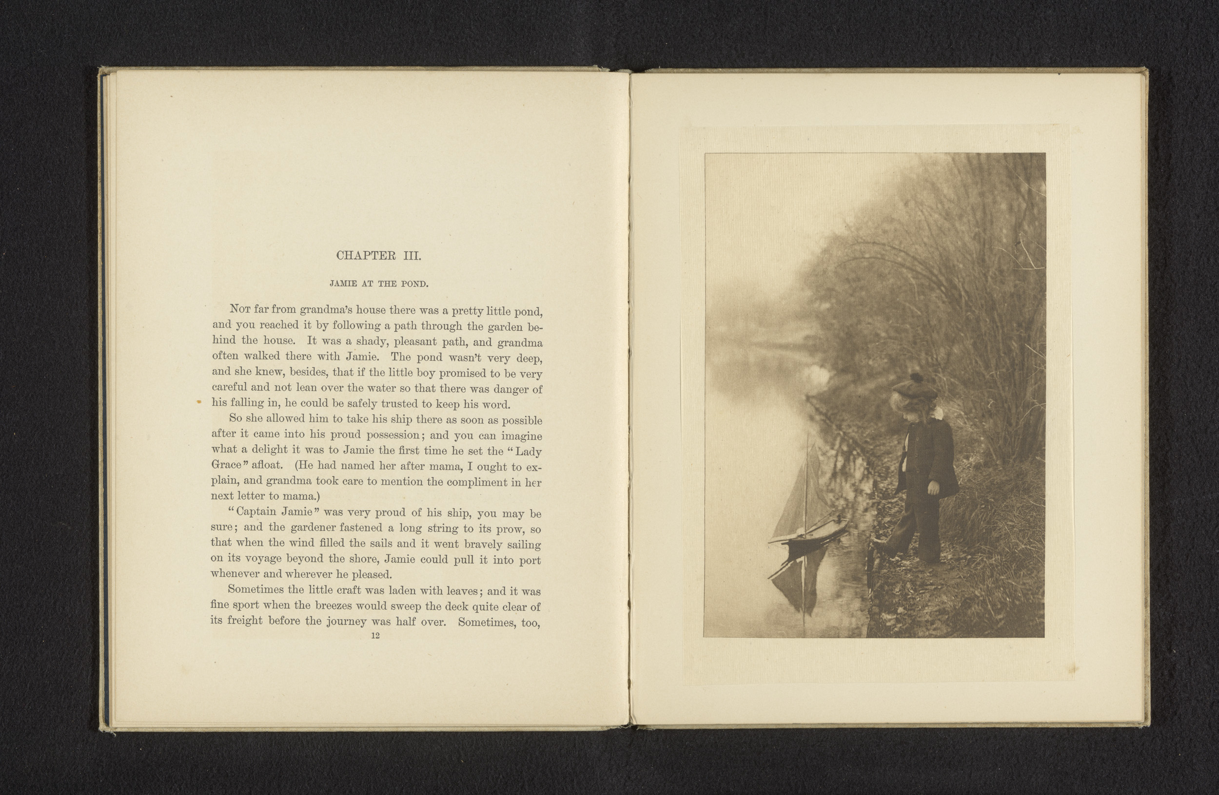 Jongen bij een vijver met een kleine boot