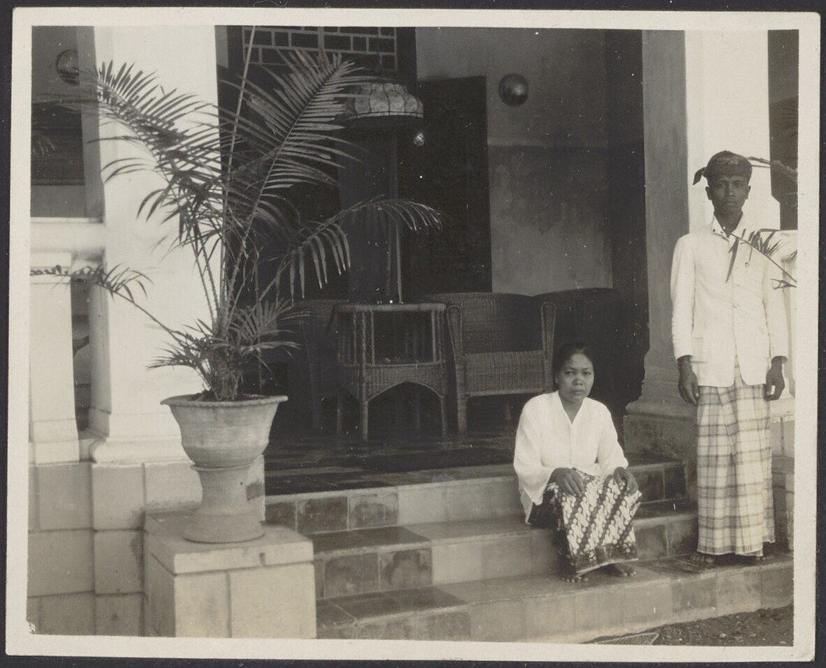 Oudere Javaanse vrouw zit bij een muurtje op straat
