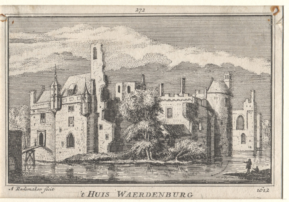 Huis Waardenburg, gedeeltelijk een ruïne. Gravure, A...
