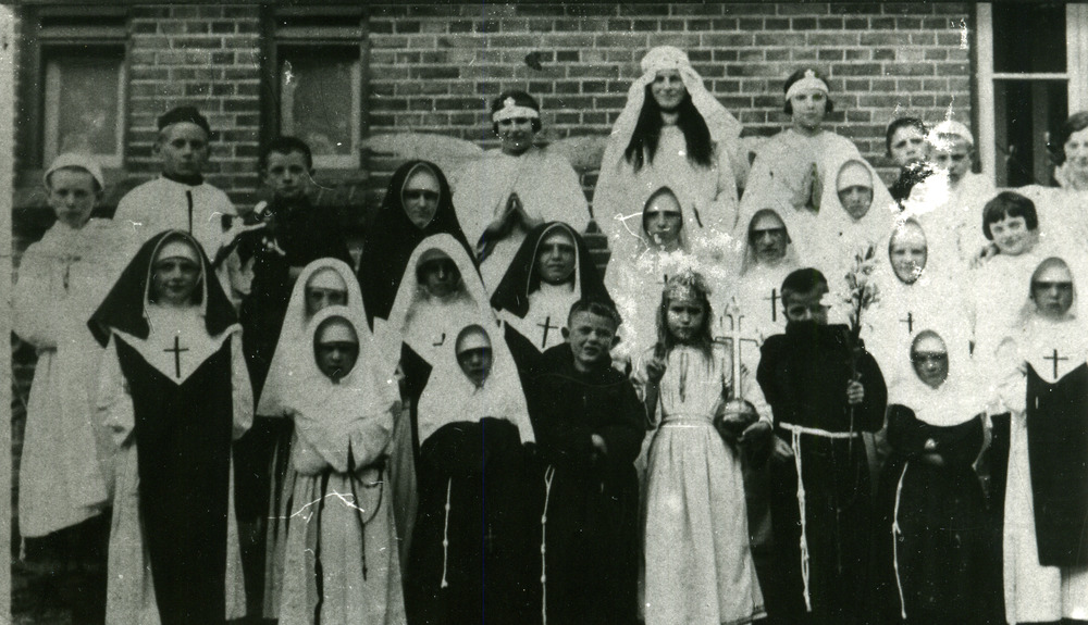 Zwart-wit foto van de kindsheidprocessie te Herwen c...