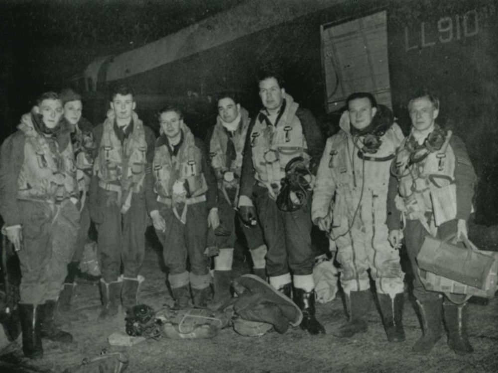 Groepsfoto van acht mannen in vliegerkledij bij inga...