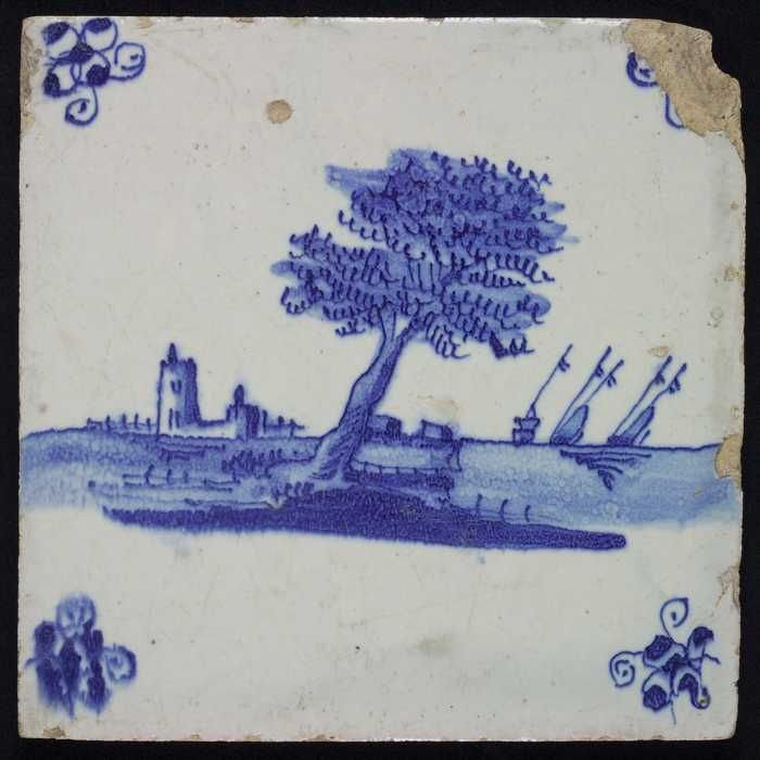 Tafereeltegel, blauw, boom met kale takken, hoekmoti...