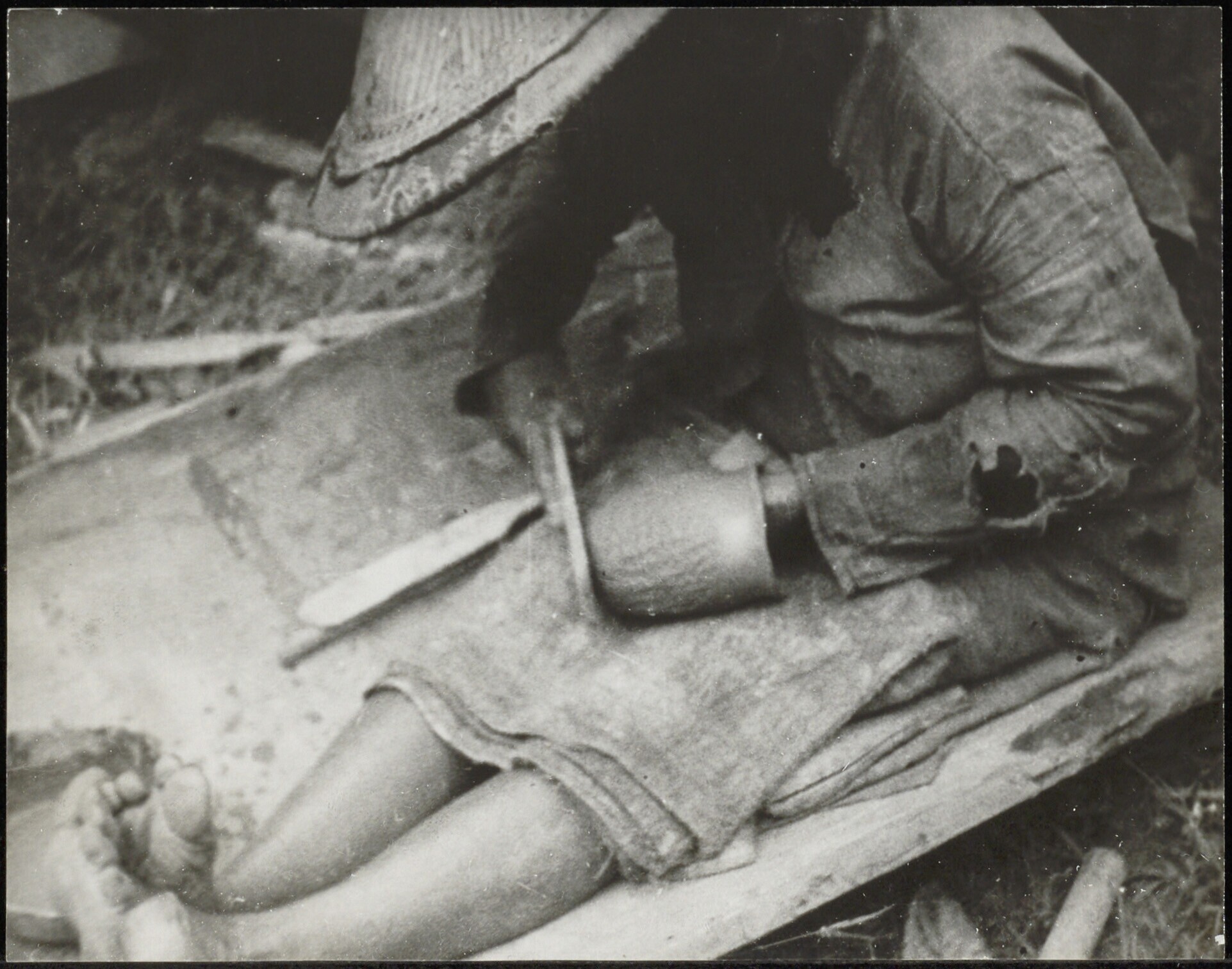 Dayaks met een tang zoekend naar bekers in resten va...