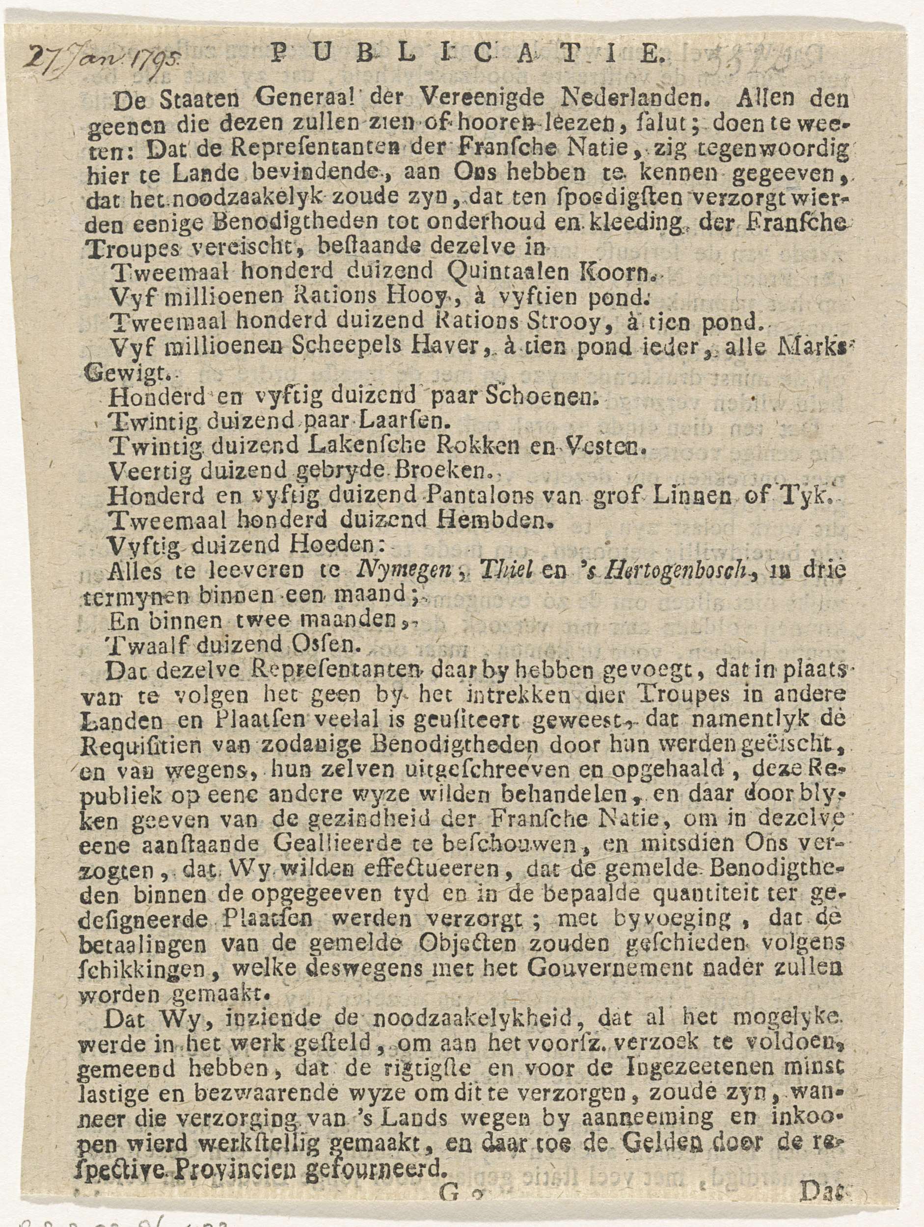 Lijst benodigdheden voor het Franse leger, 1795