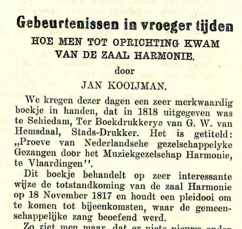 Artikel oprichting zaal Harmonie, Vlaardingen