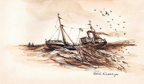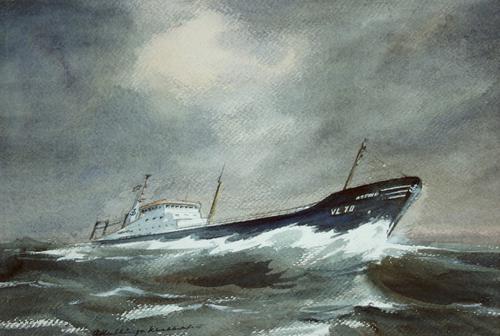 Aquarel met pen. Trawler VL70 Astrid op ruwe zee