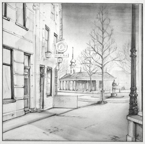 Tekening. Visbank gezien vanuit de Smalle Havenstraa...