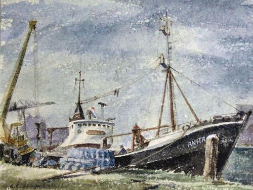 Aquarel. Haring Trawler VL34 Anita in de Koningin Wi...