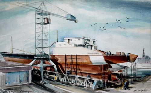 Aquarel met pen. Scheepsdeel VL70 Astrid in de takel...