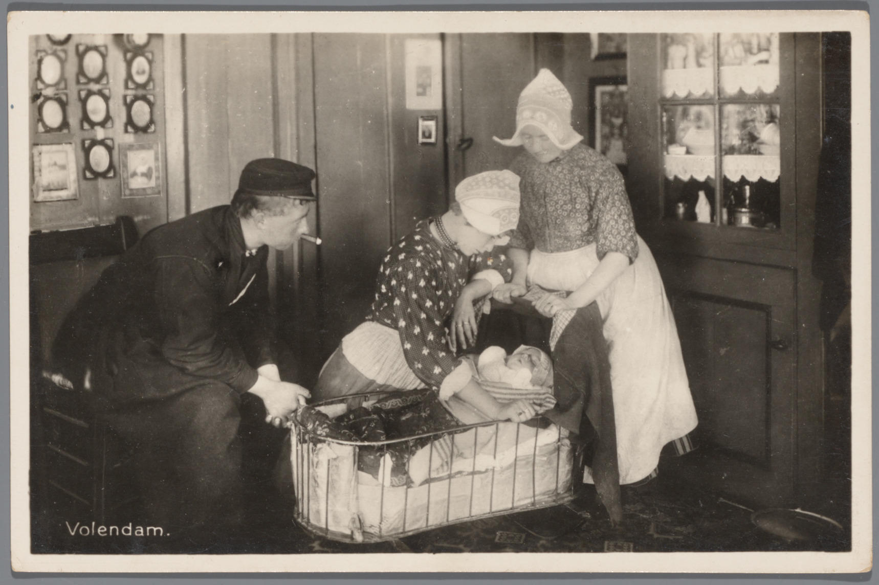 Man, vrouwen en baby in Volendammer streekdracht