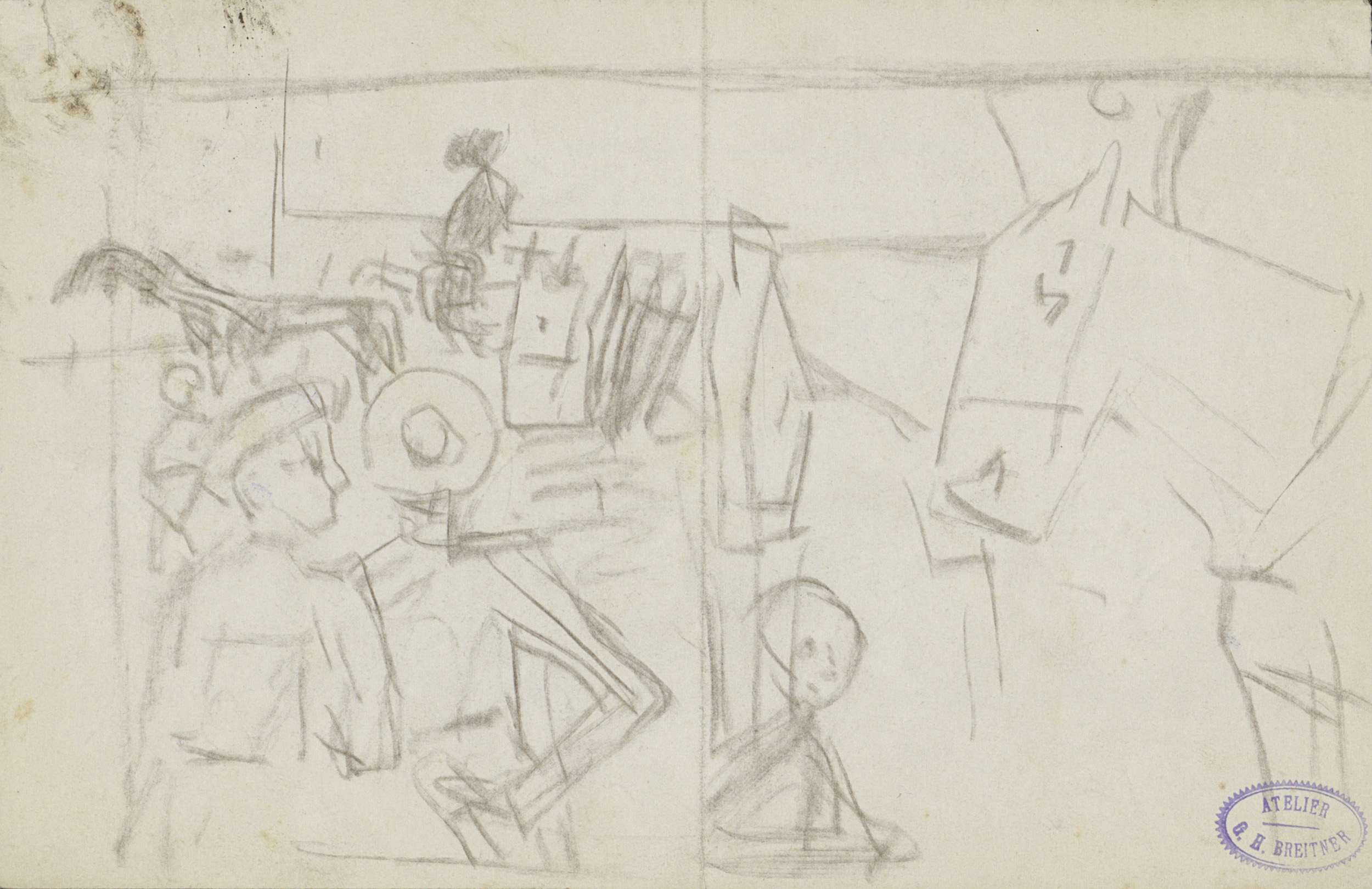 Figuren bij aangespannen paarden, mogelijk trampaarden