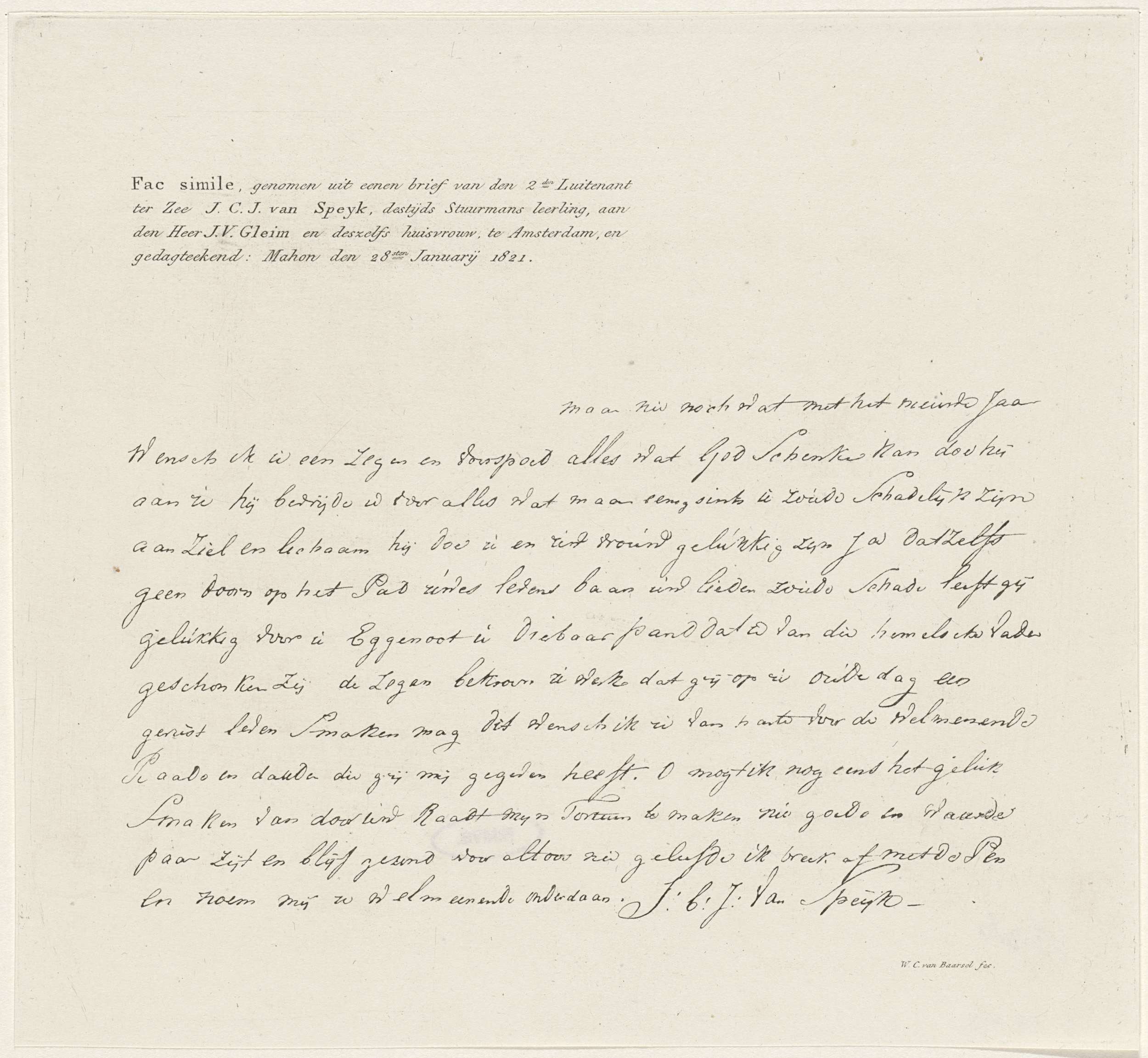 Facsimile van een brief van Jan van Speyk aan zijn n...