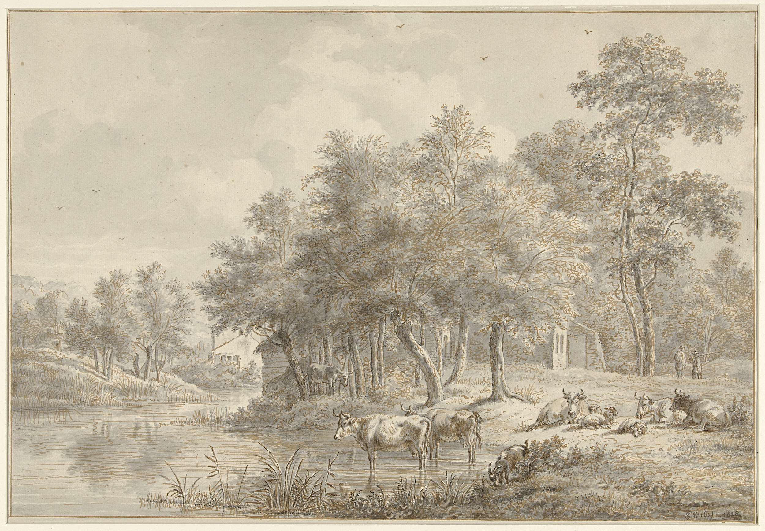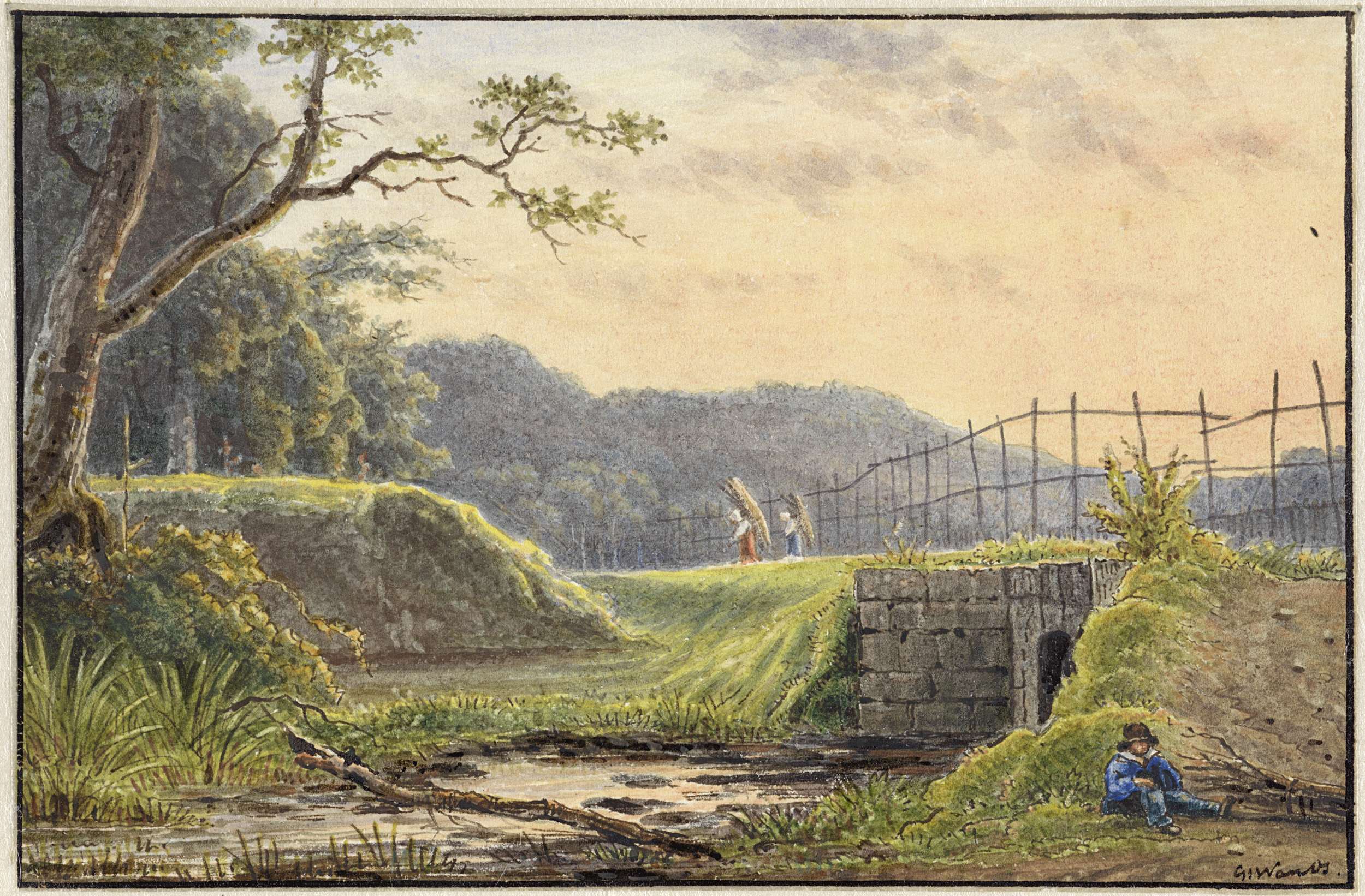 Landschap met figuren in een roeibootje