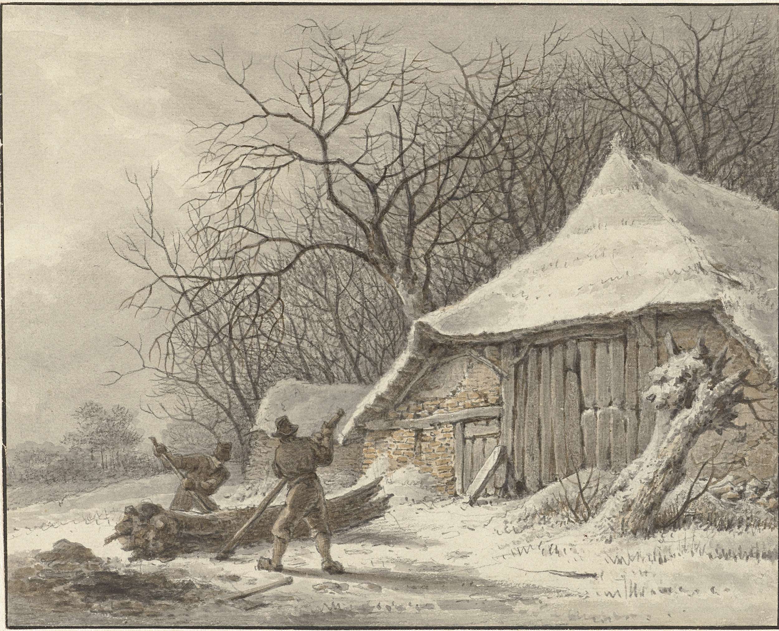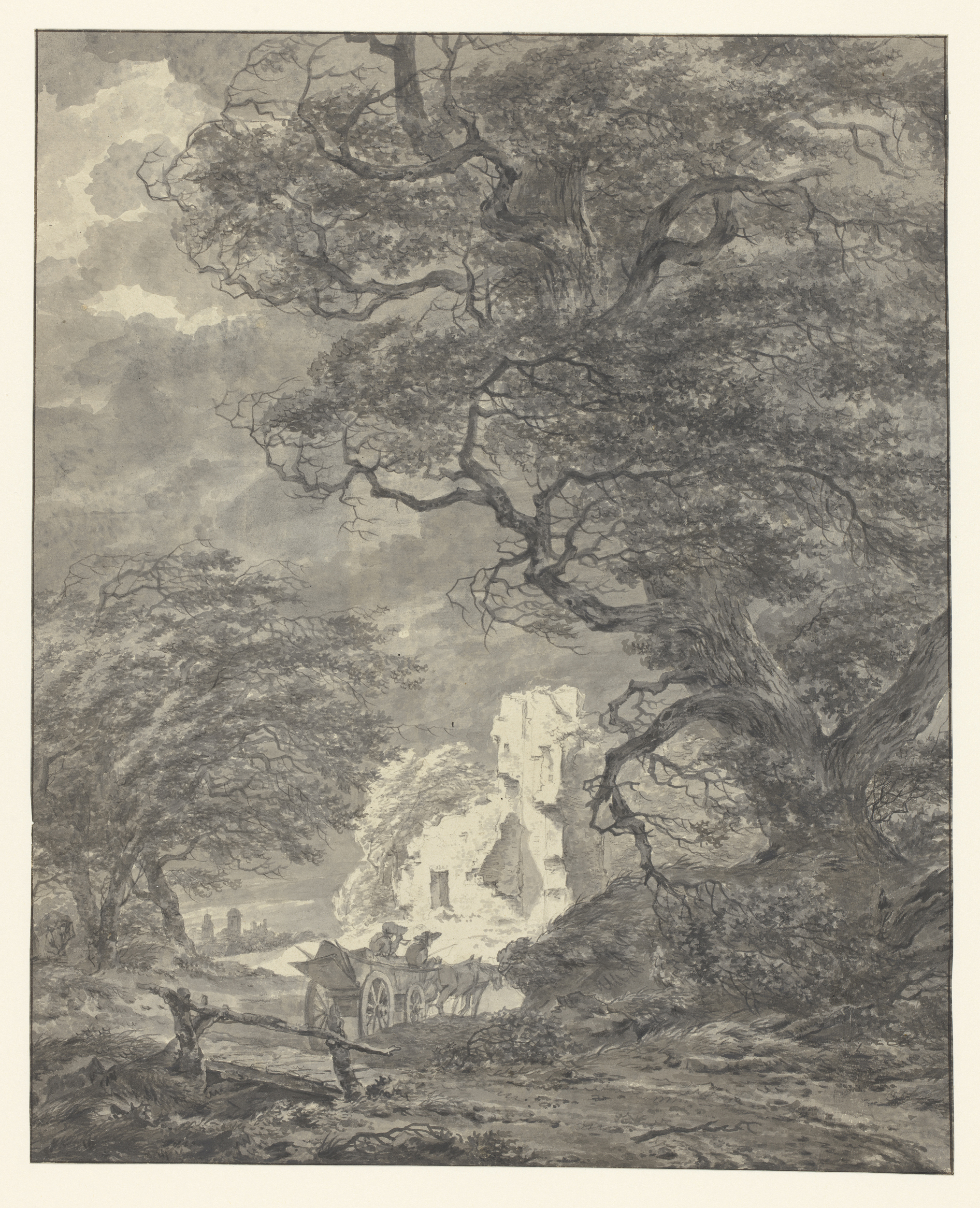 Landschap met twee figuren onder bomen