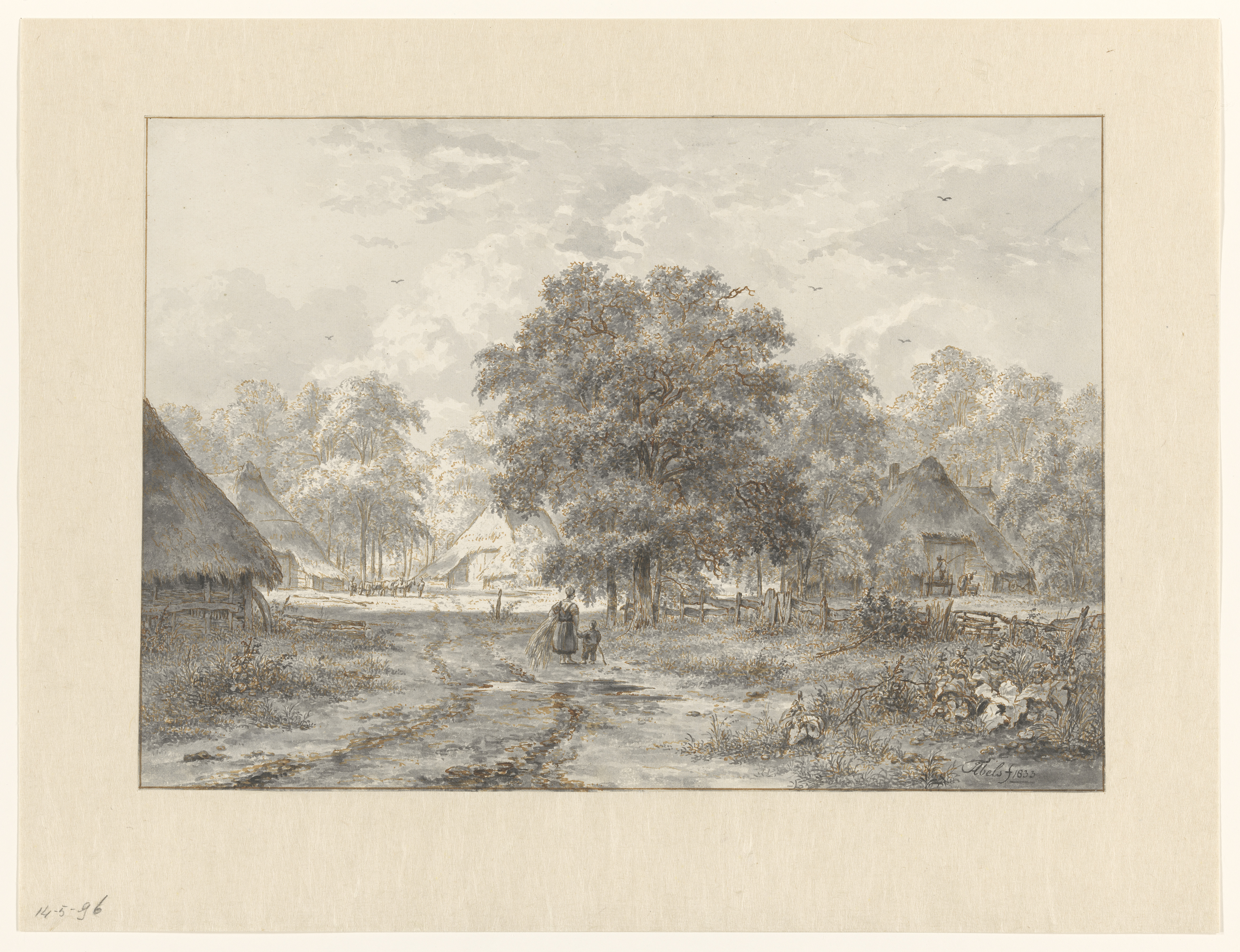 Landschap met boerderijen tussen bomen