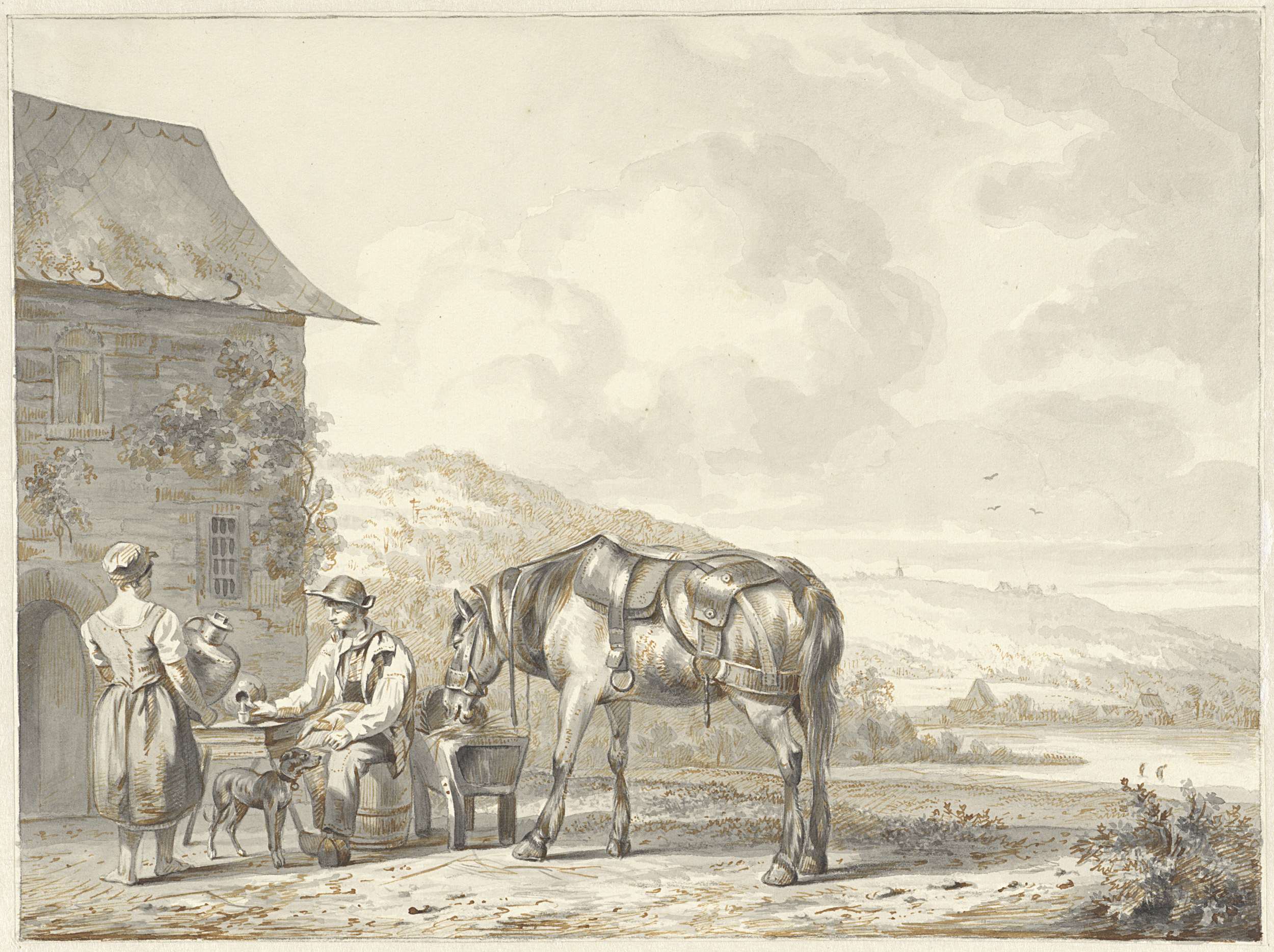 Man met paard, rustend bij een herberg