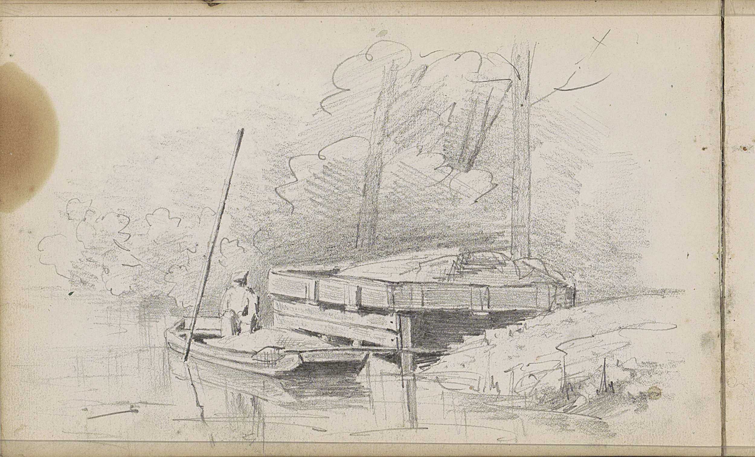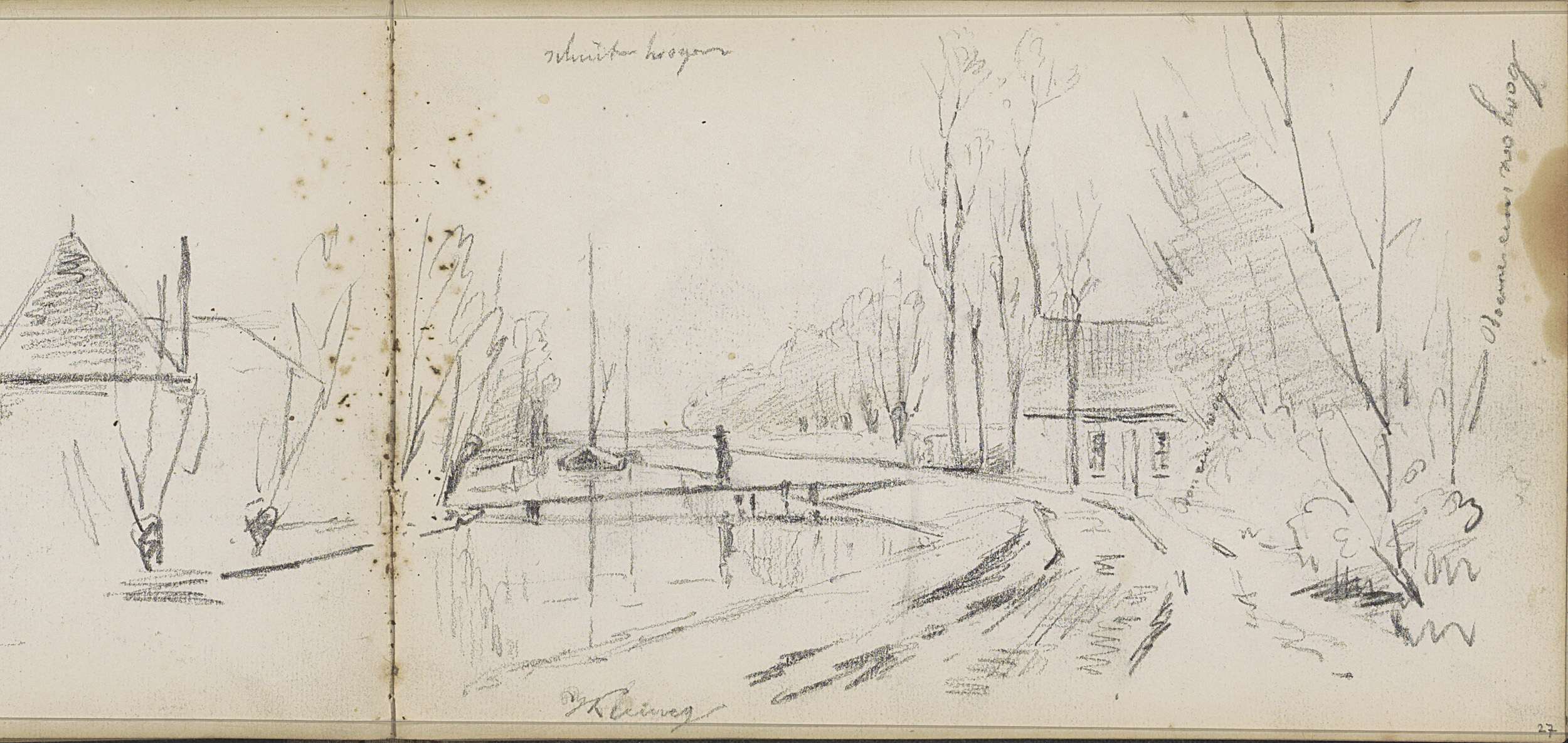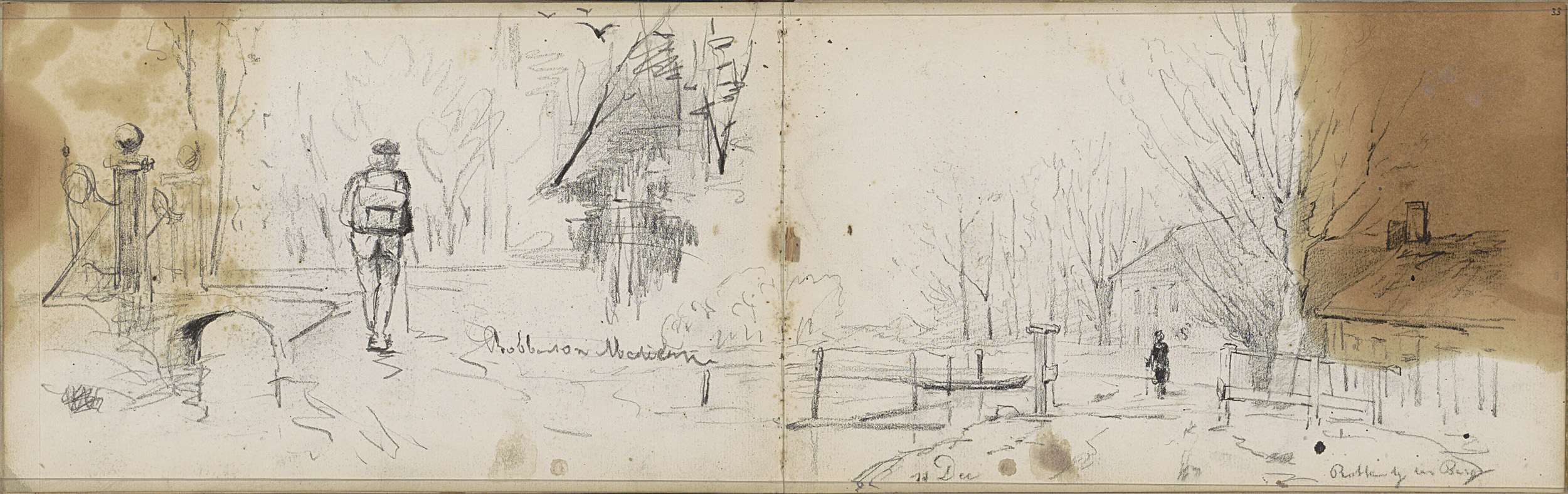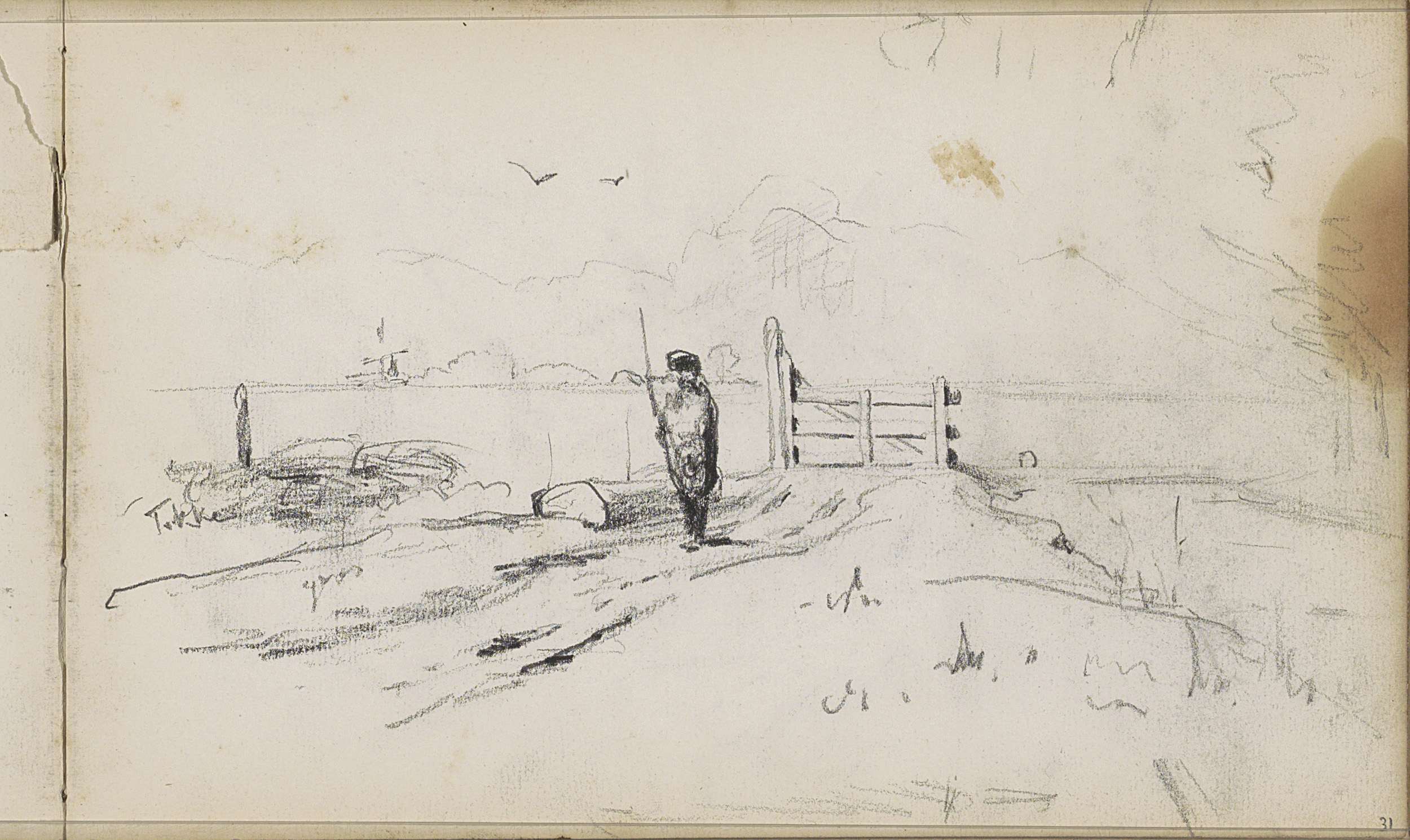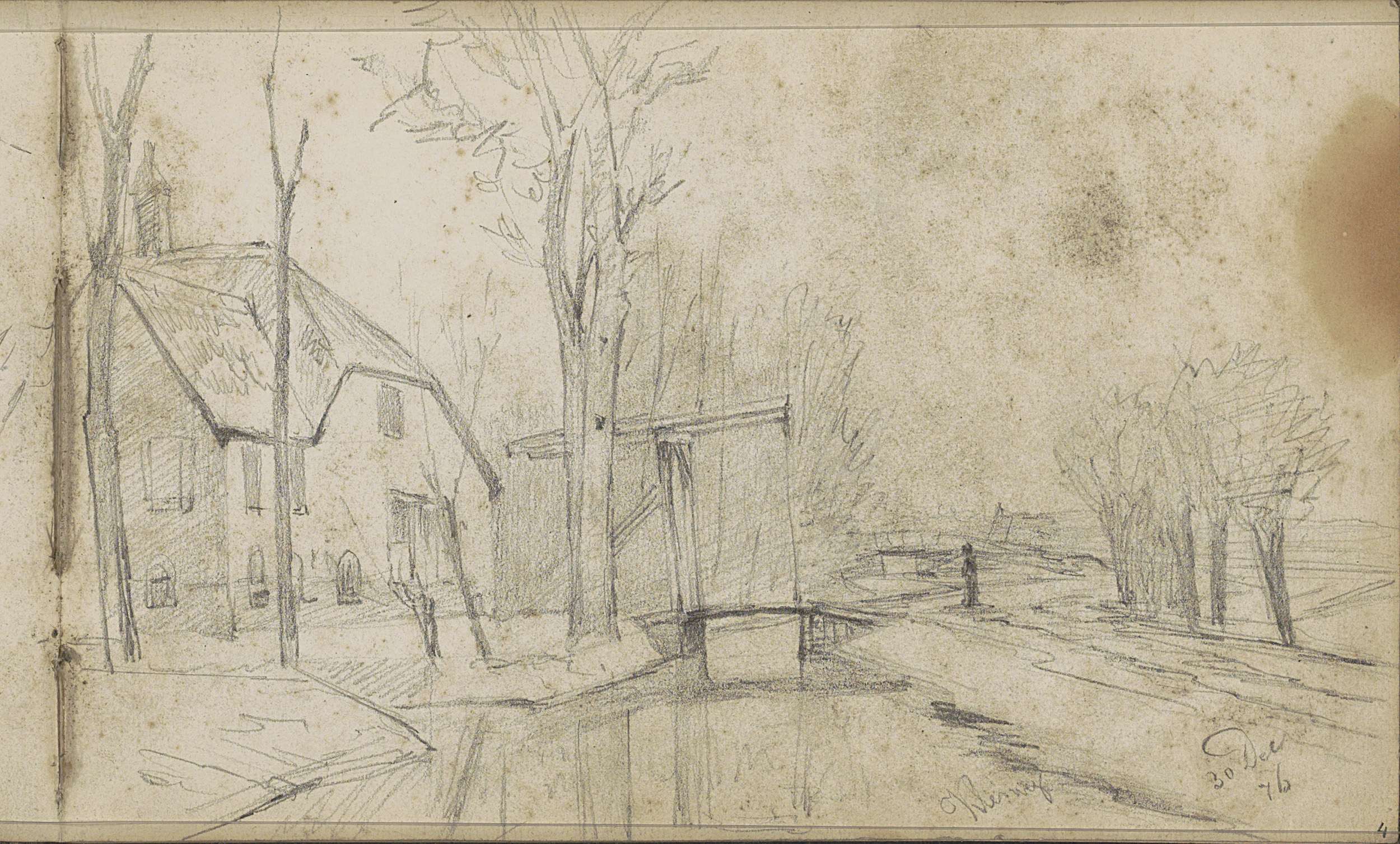 Brug, een wandelaar en huizen en een pad langs de Rotte