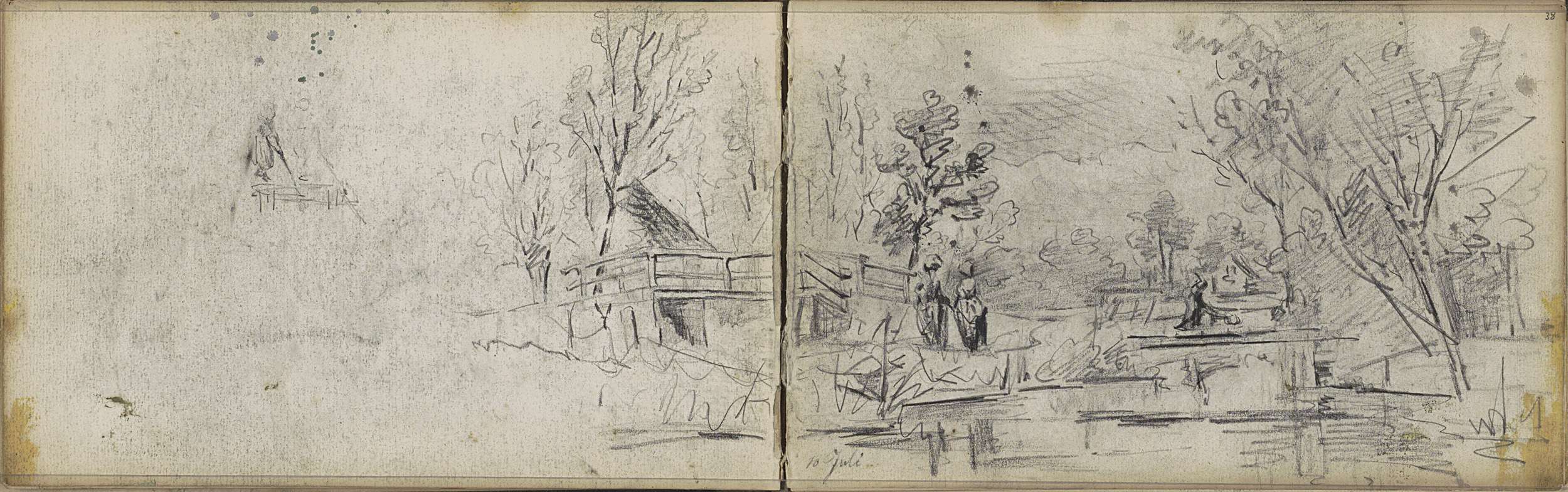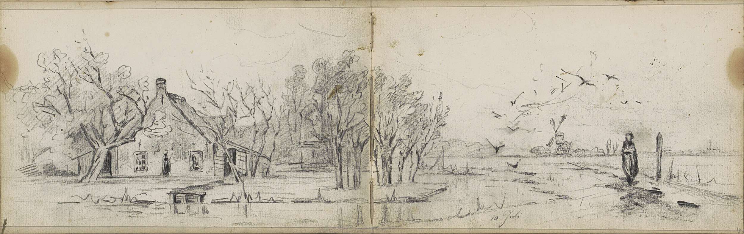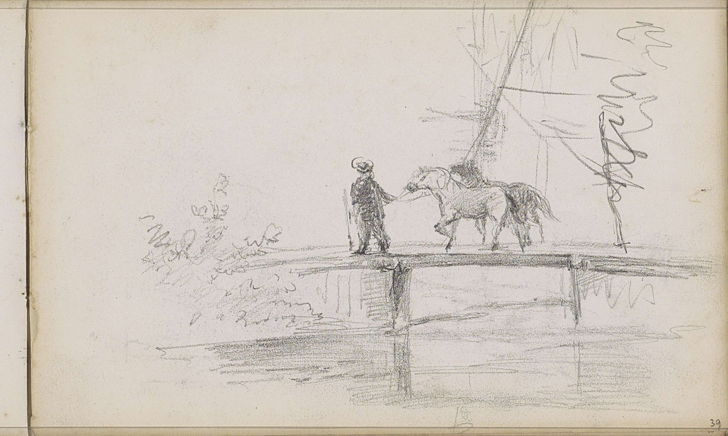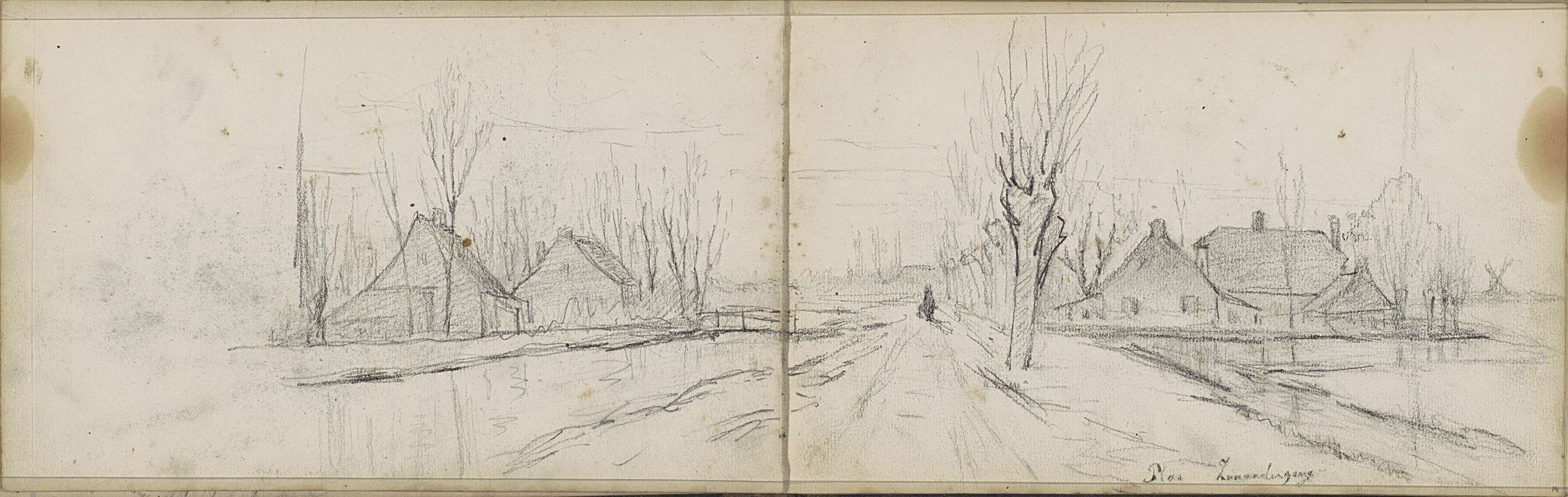 Brug, een wandelaar en huizen en een pad langs de Rotte
