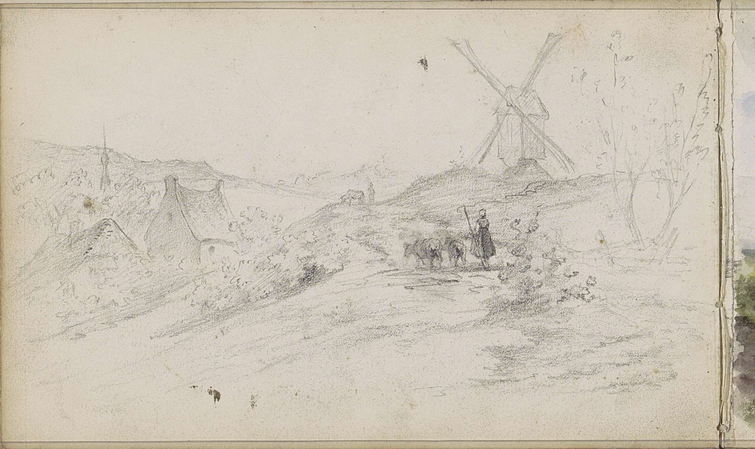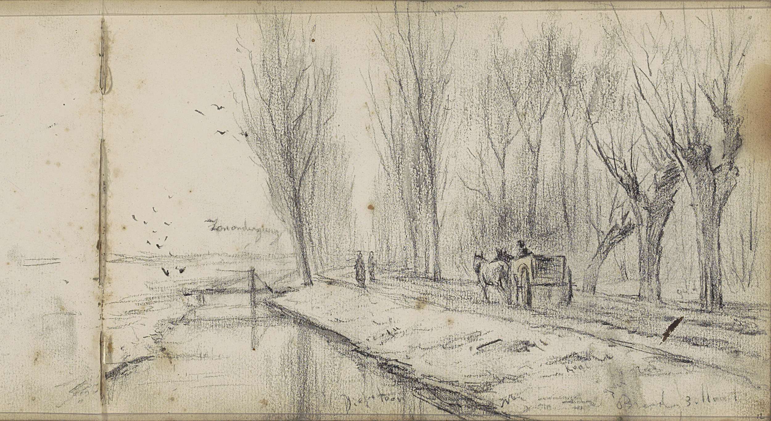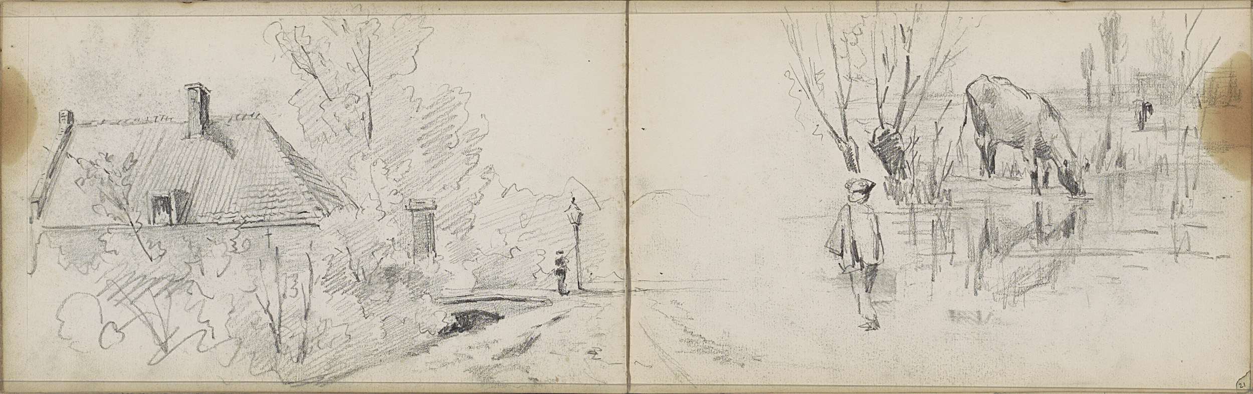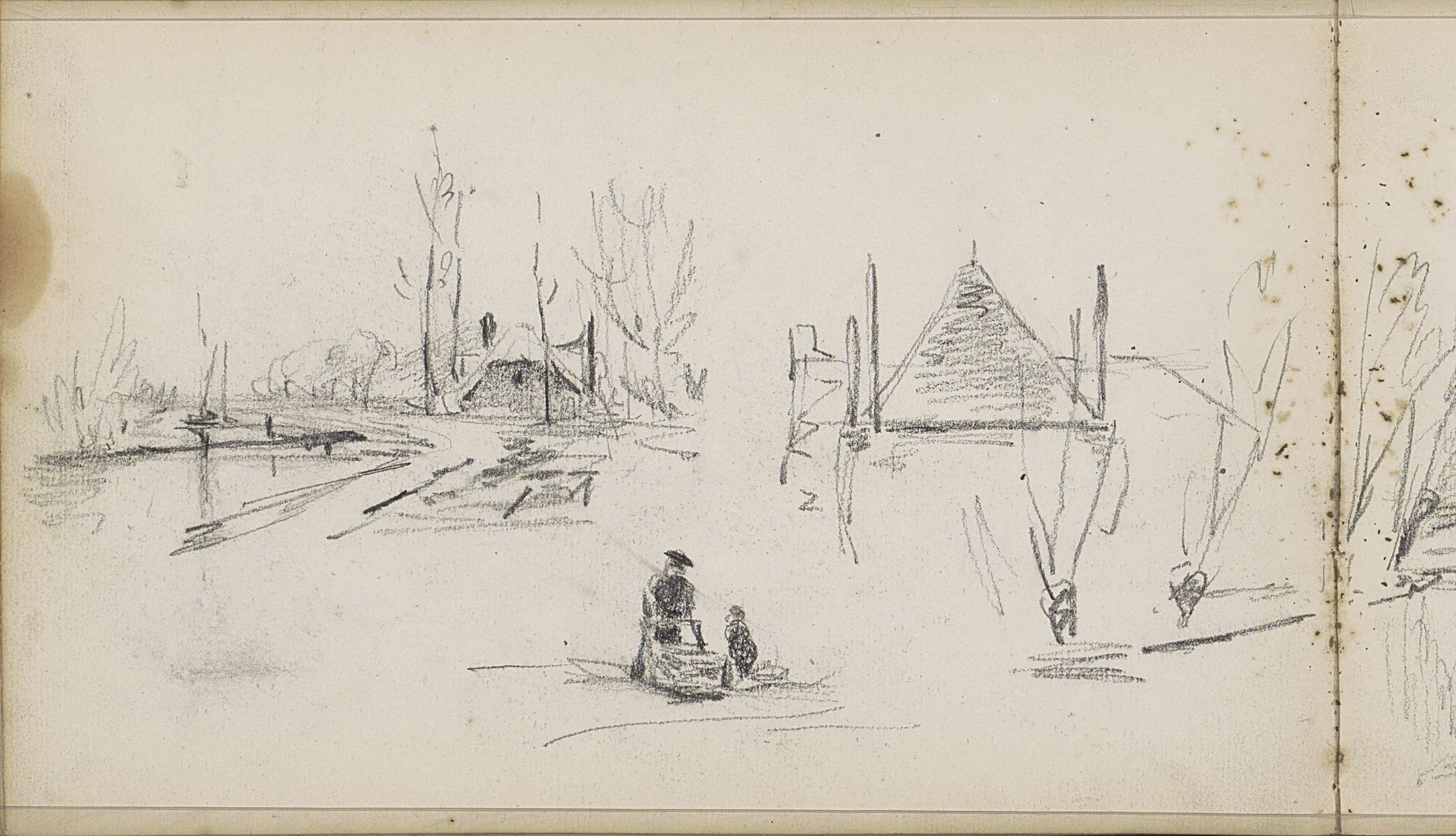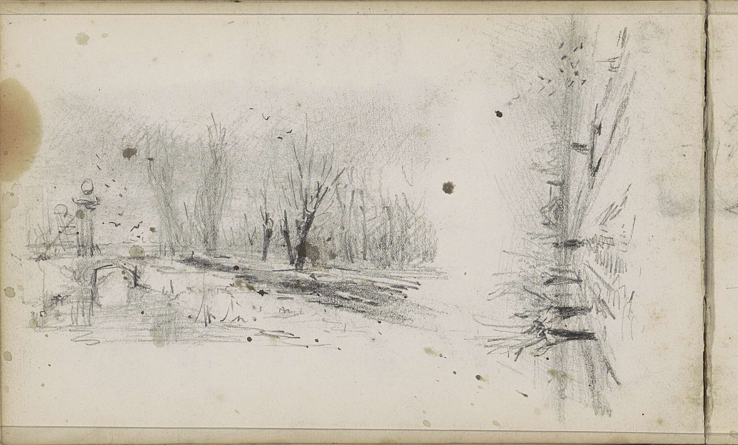 Brug, een wandelaar en huizen en een pad langs de Rotte