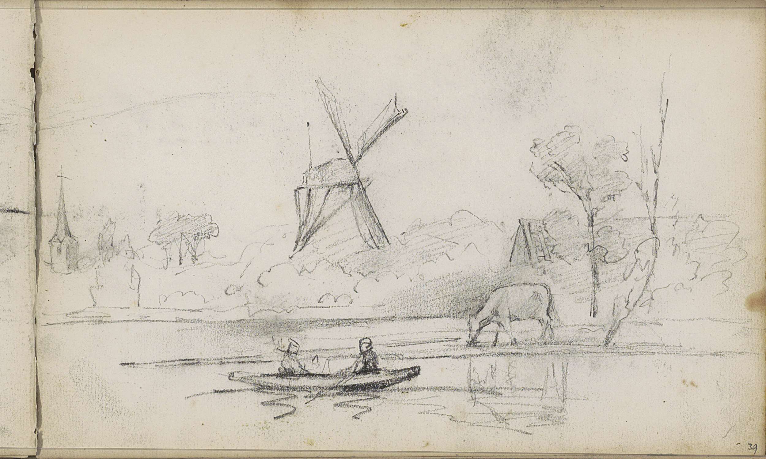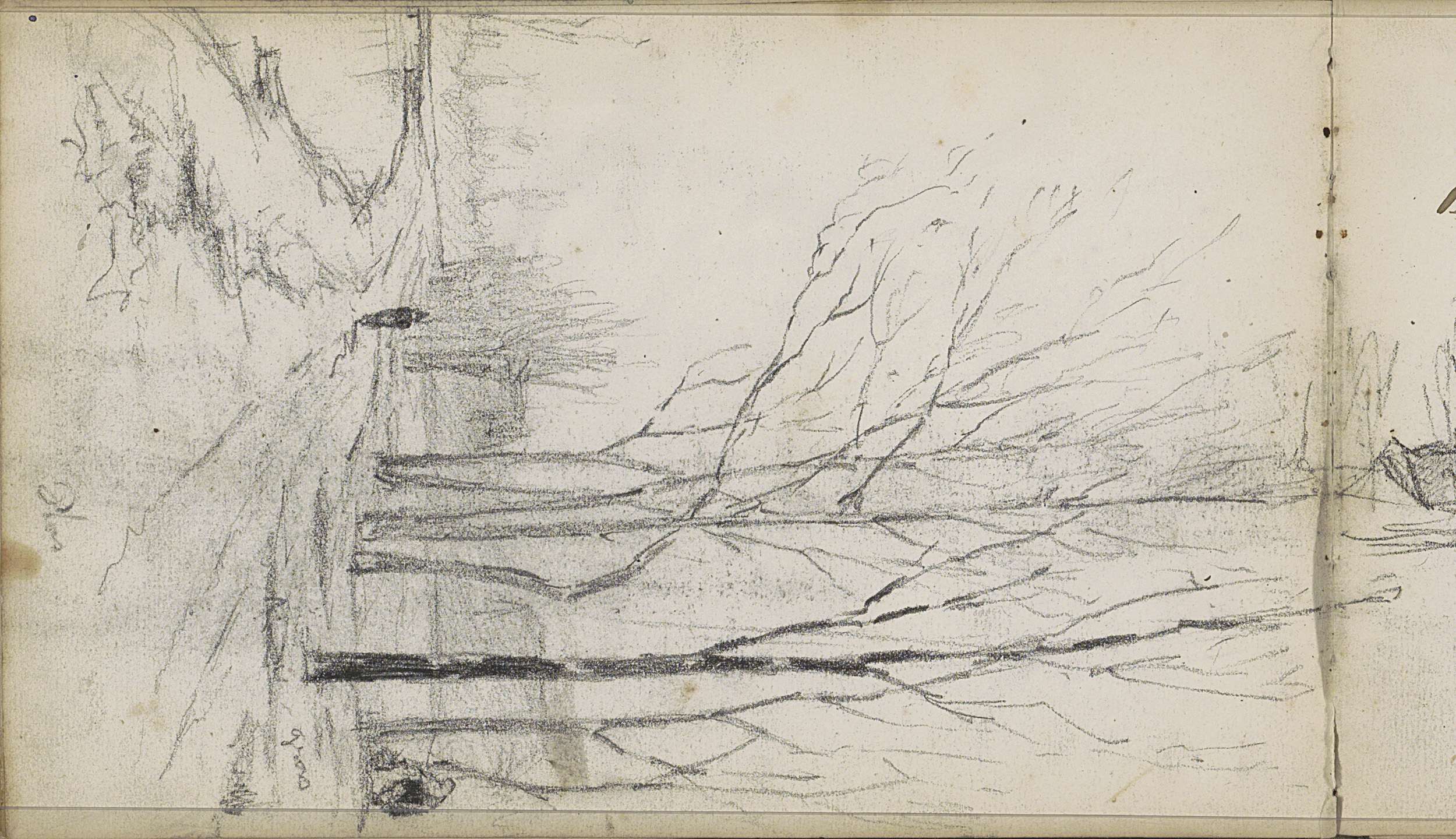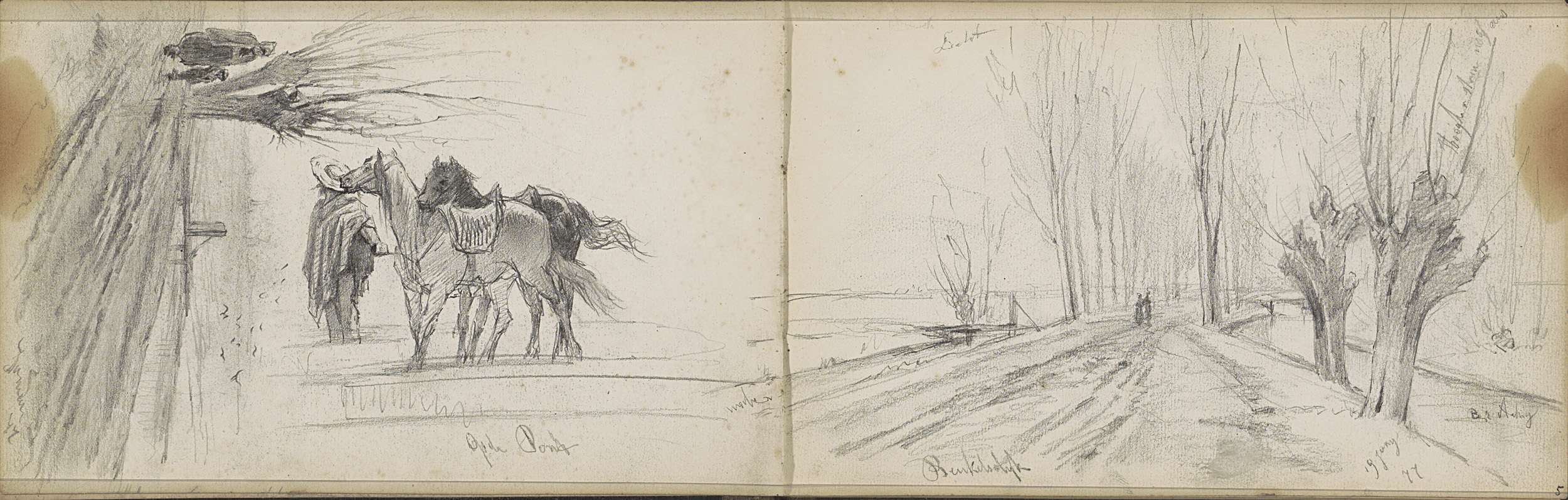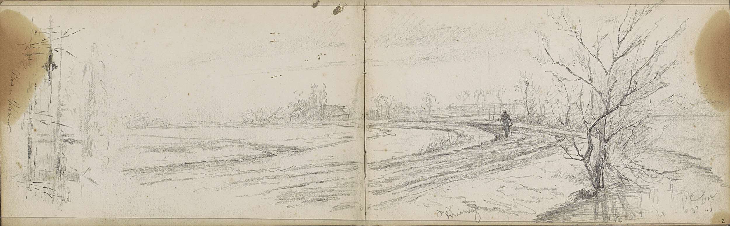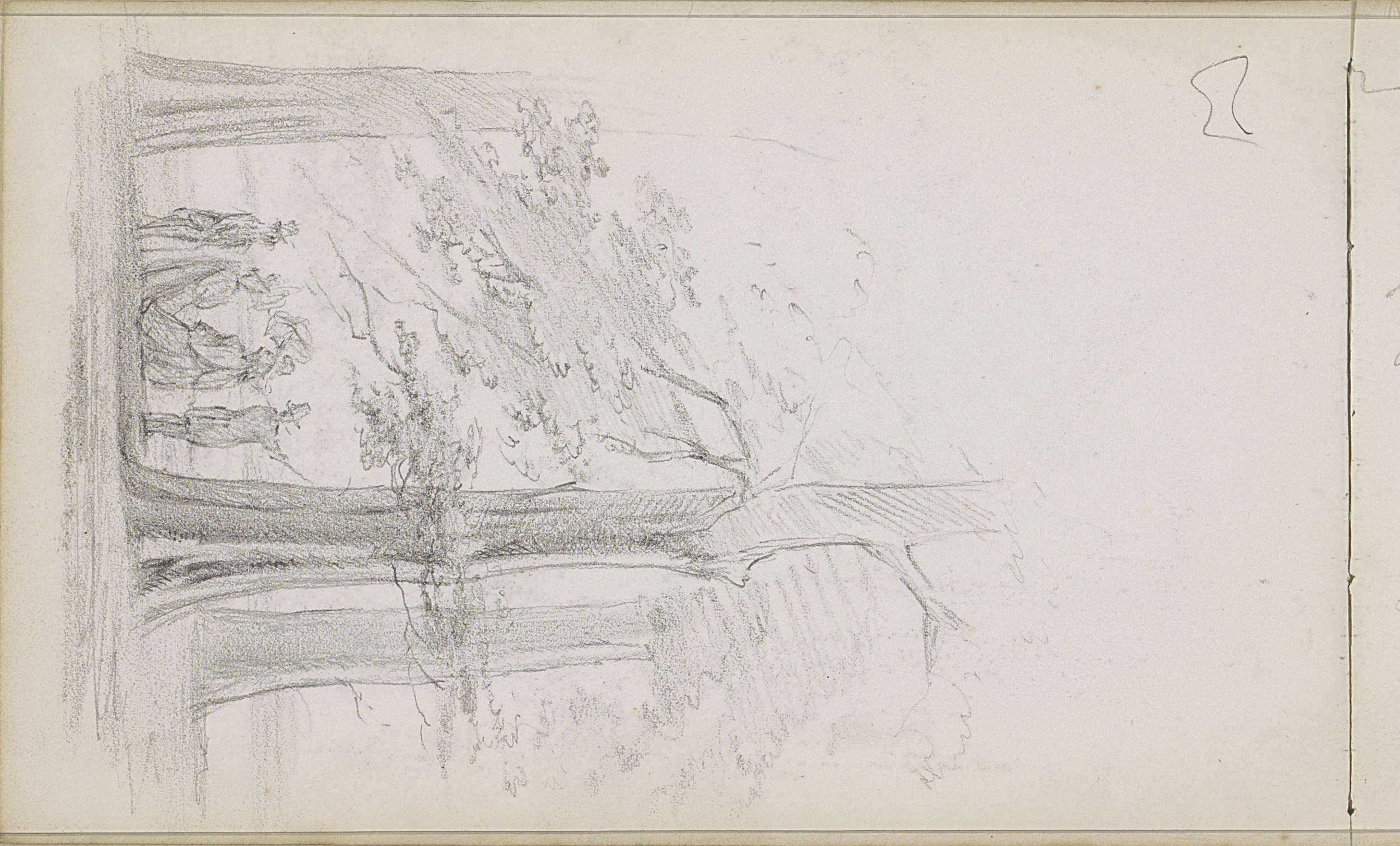 Brug, een wandelaar en huizen en een pad langs de Rotte