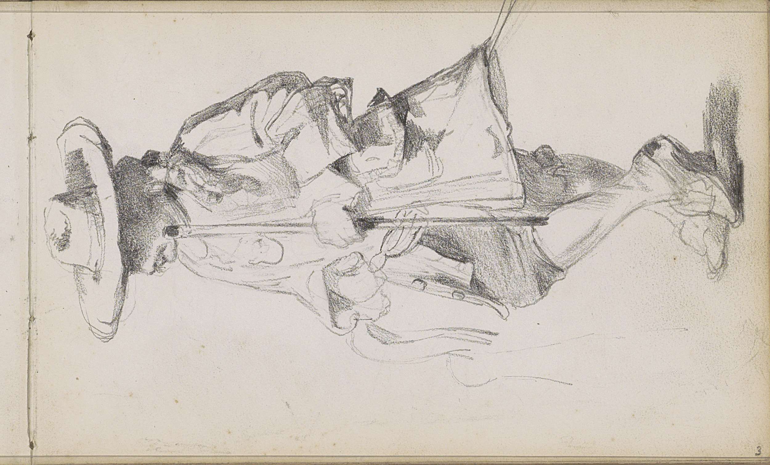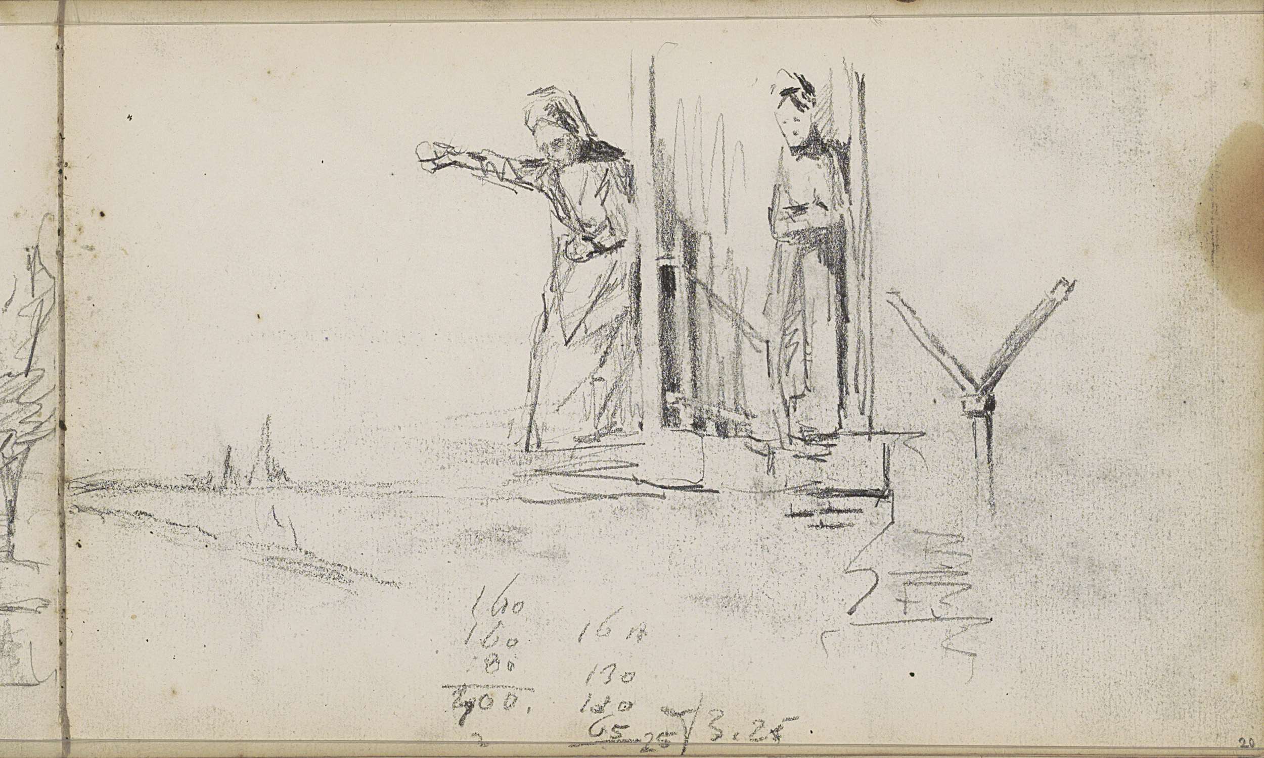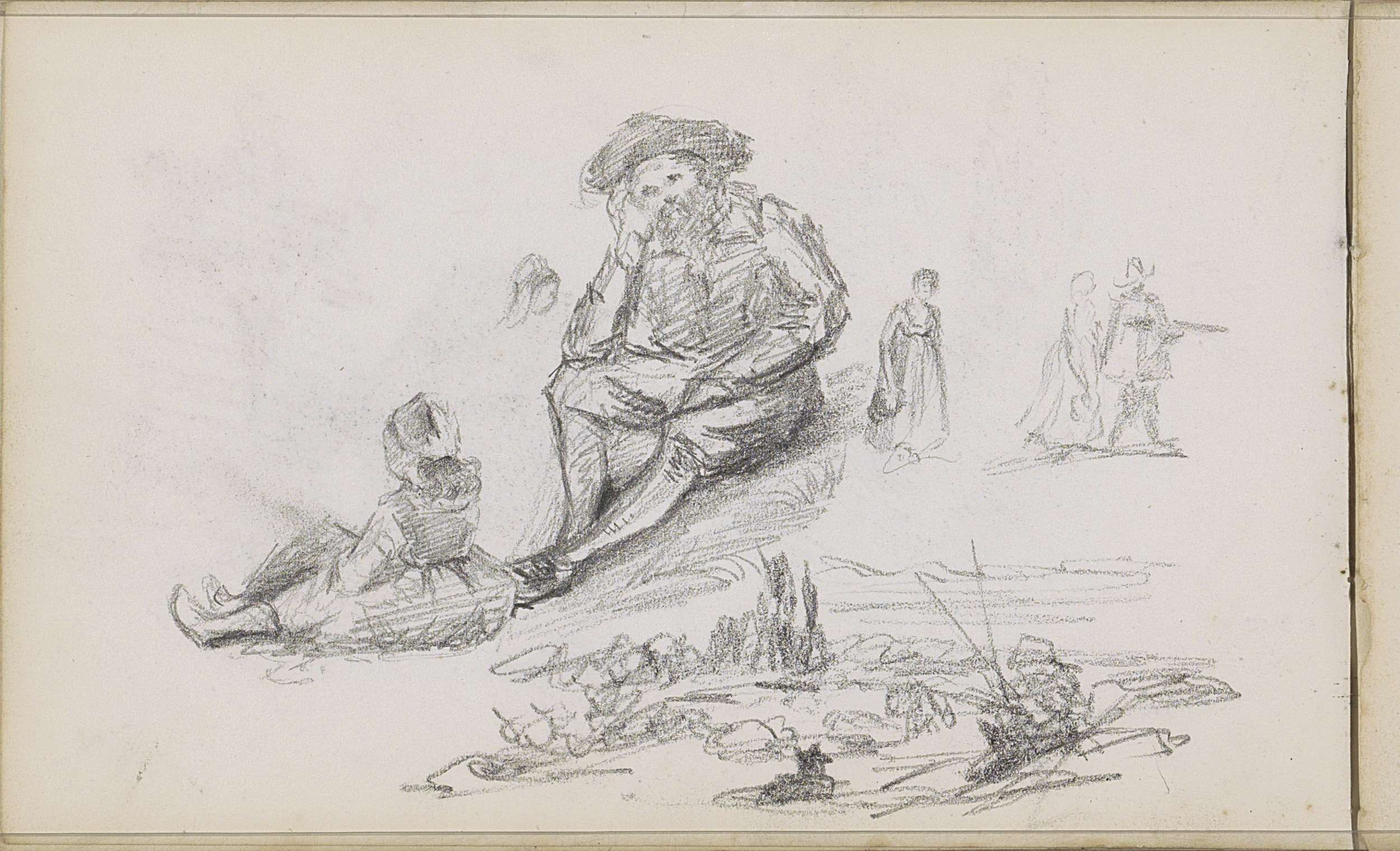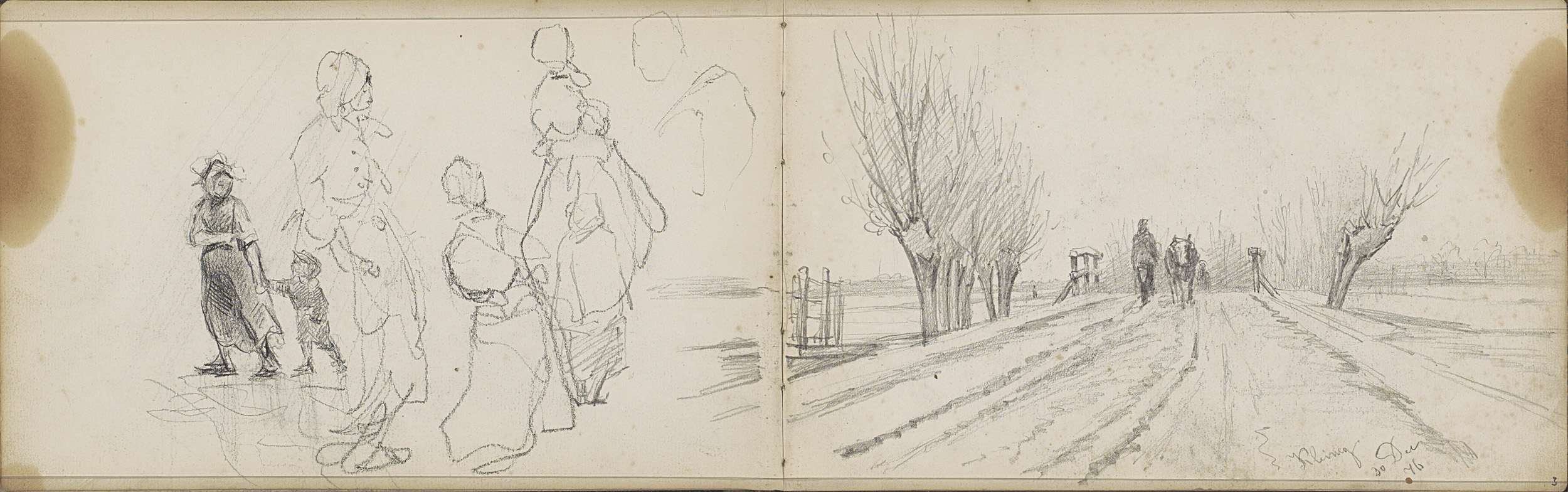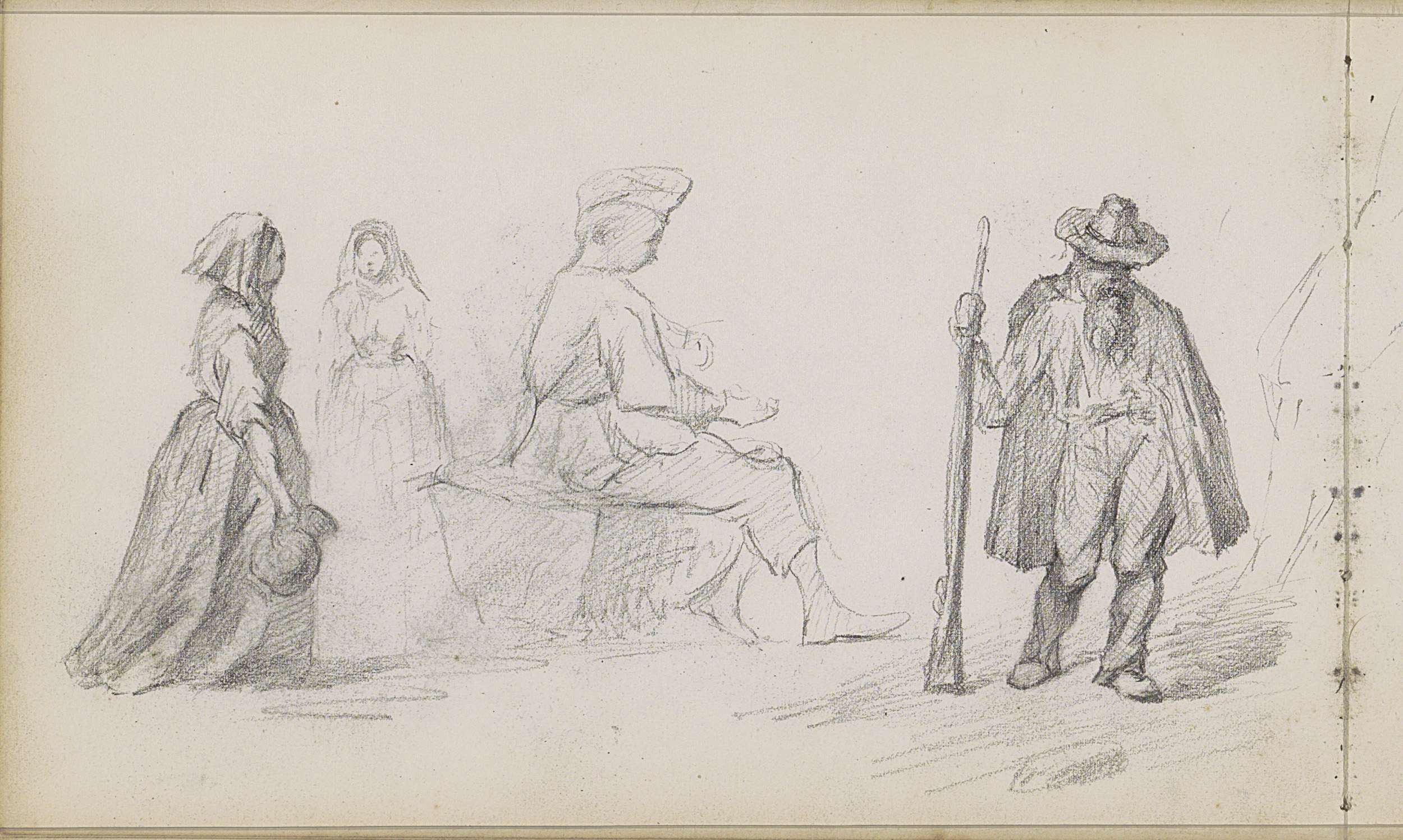Lezende vrouw met wandelstok en een vrouw met een ki...