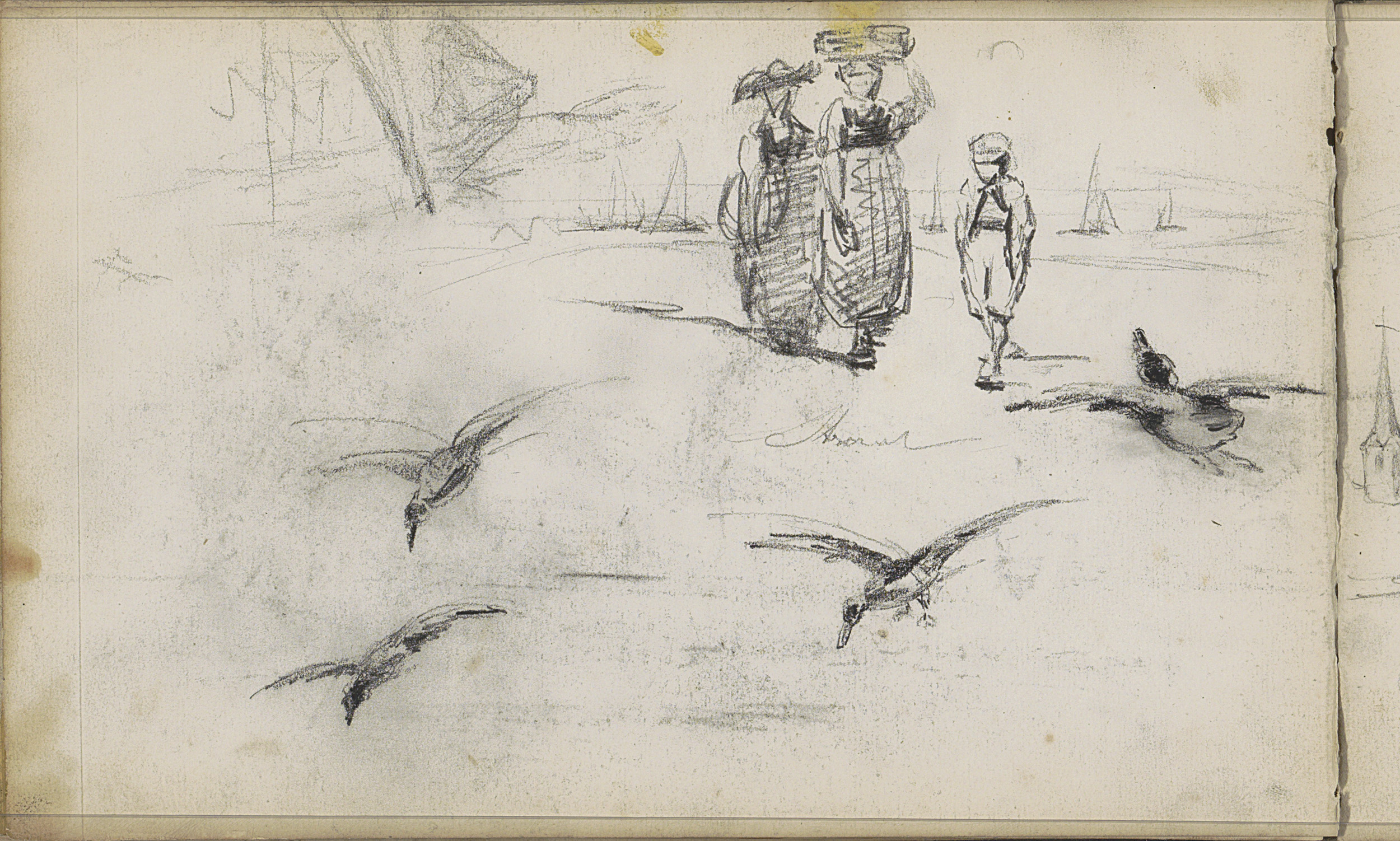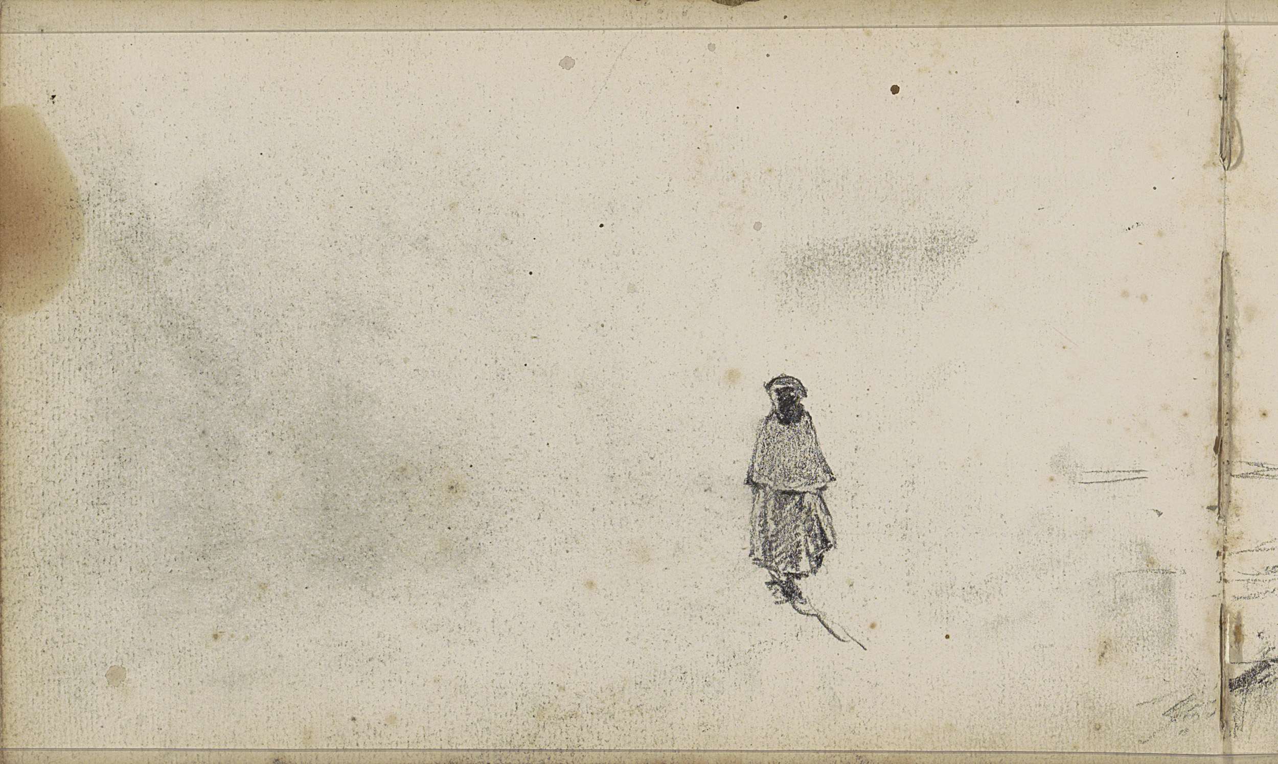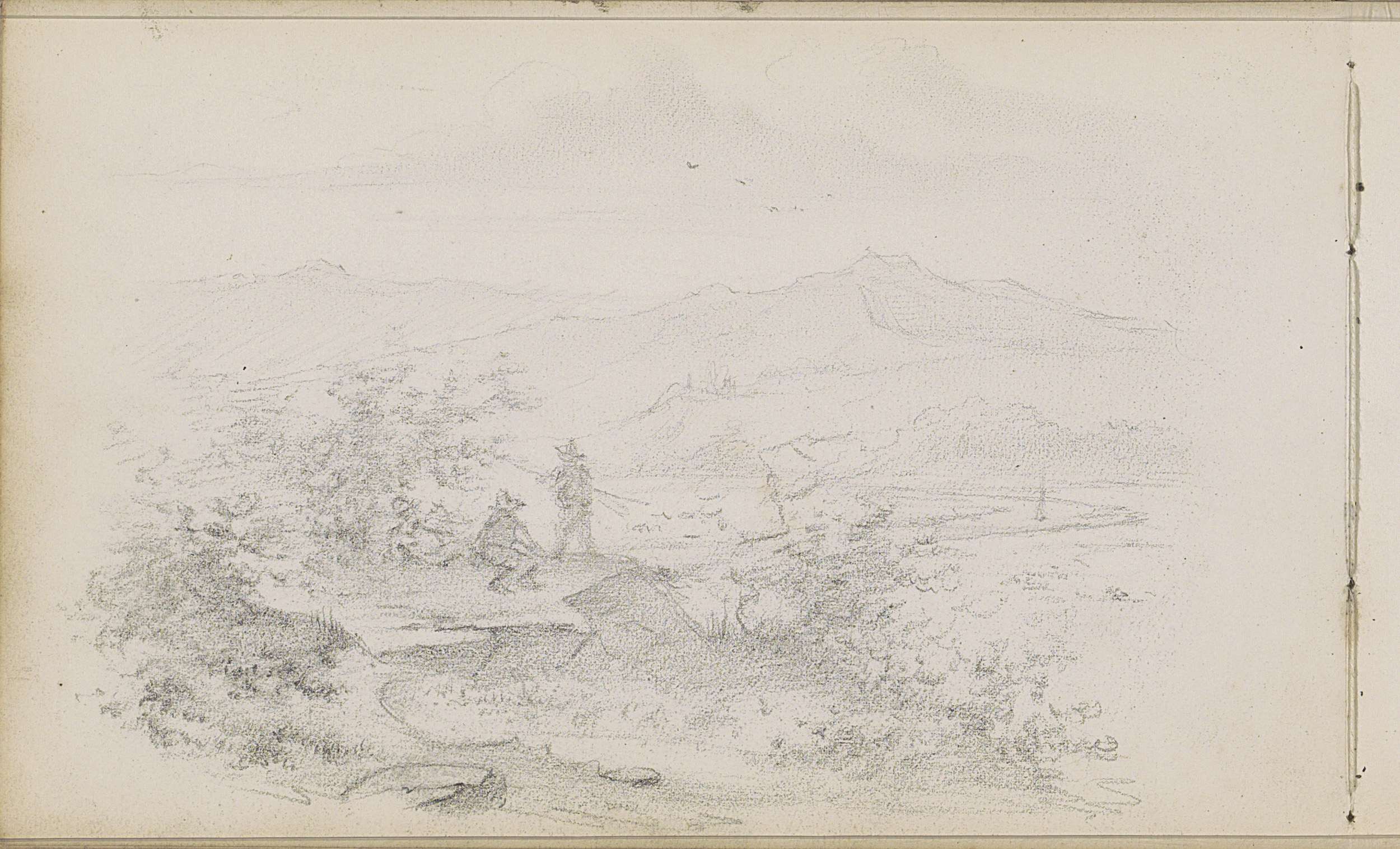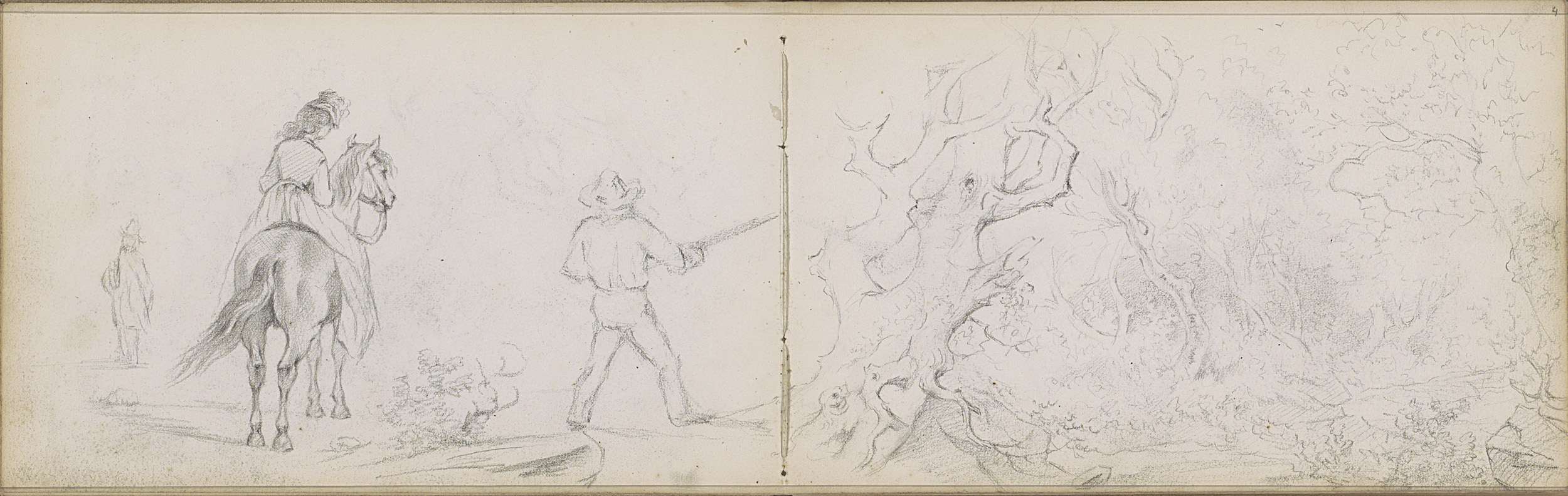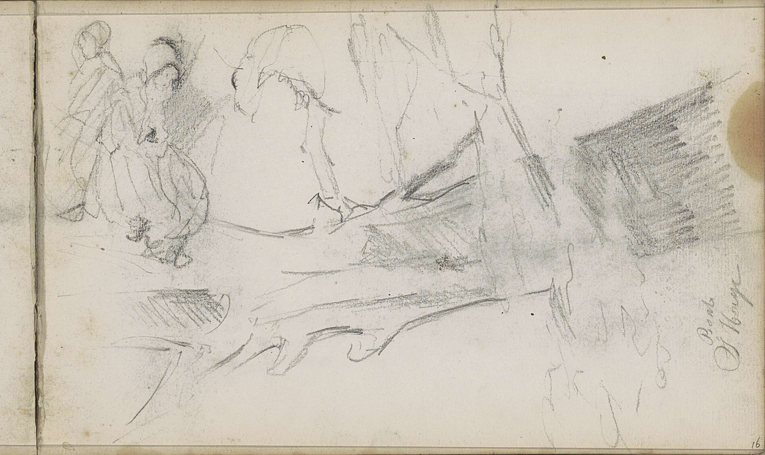Lezende vrouw met wandelstok en een vrouw met een ki...