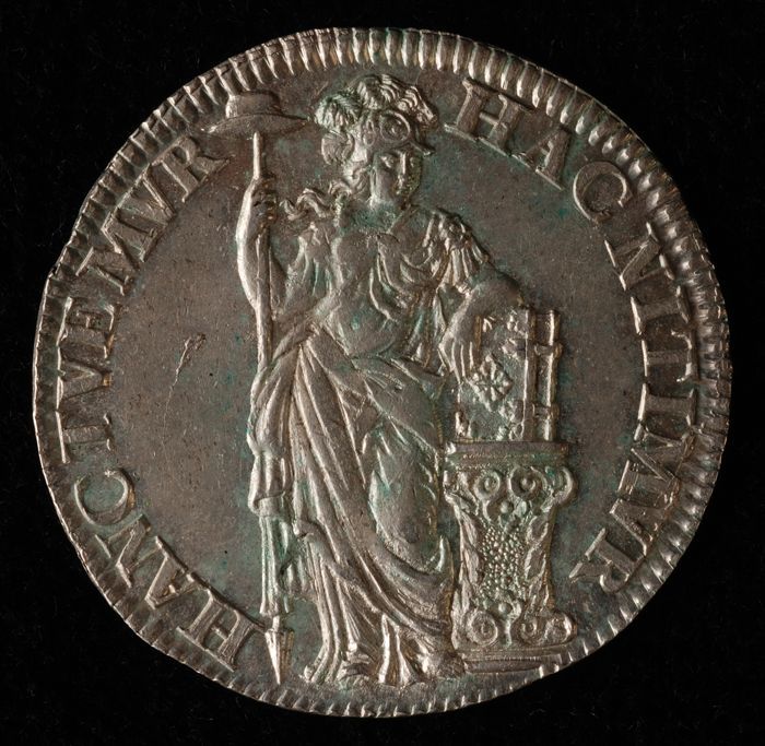 Plaquette aan draagoog met vrouw die lauwerkrans aan...