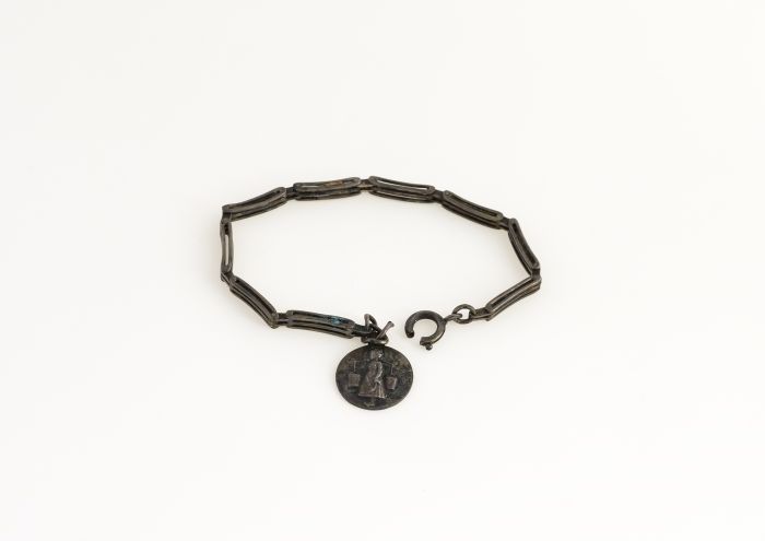 Zilveren schakelarmbandje met rond medaillon met daa...