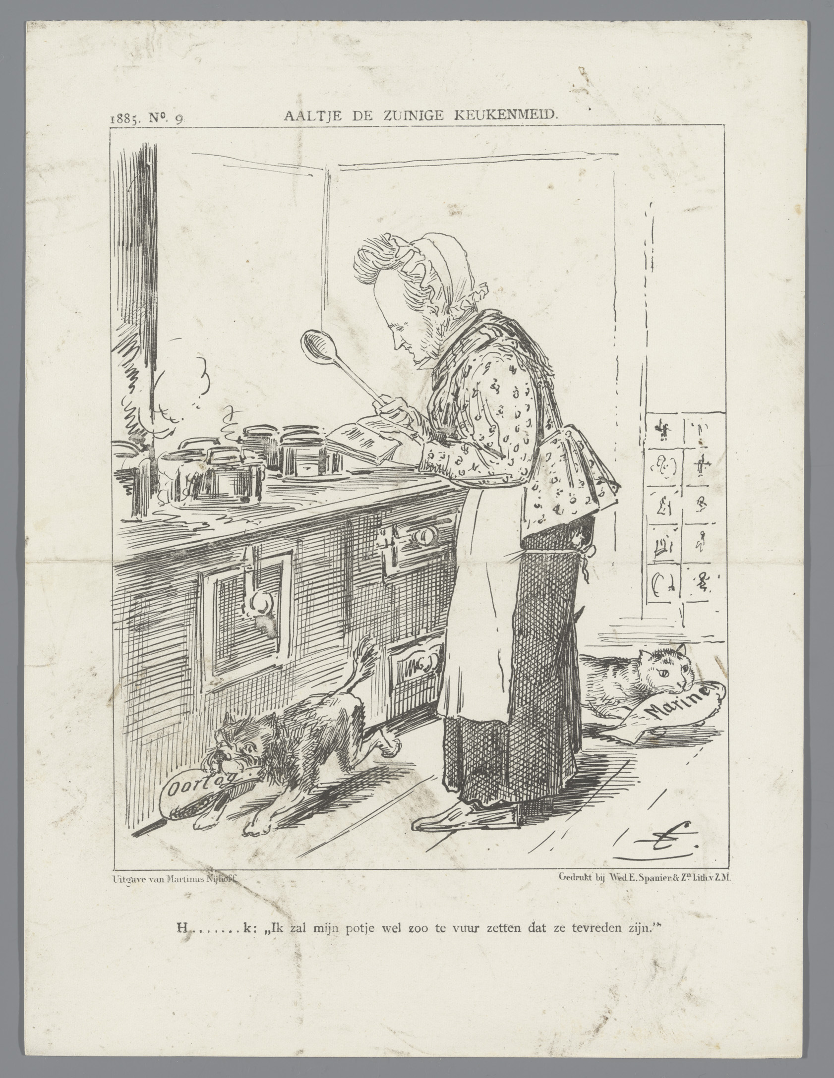 Spotprent op Heemskerk als een keukenmeid, 1885